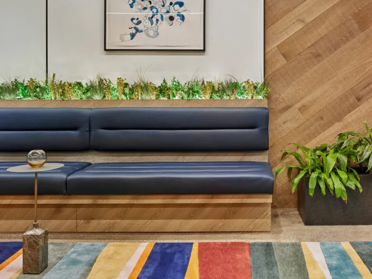 Wood, plantings and natural light have been incorporated throughout the space, introducing a biophilic element to promote wellbeing. Preserved plants and reindeer moss were specified rather than real greenery due to the fact certain areas in the space lacked natural sunlight.
