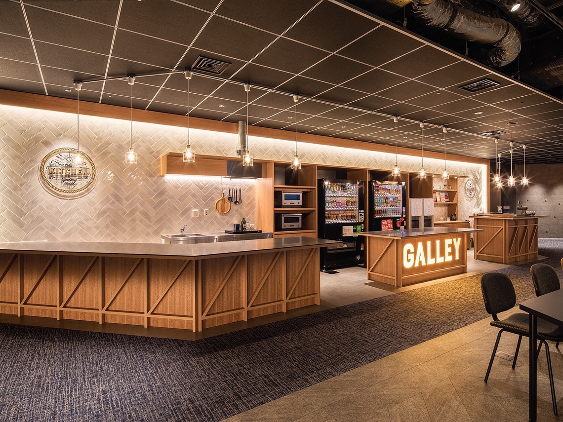 Upon entering, in the centre of the stunning space is the company bar Ajito. Each area in the space is connected seamlessly, the café space Lagoon with it's flexible layout, the company library Oasis which doubles up as a concentration space. Hill and Beach are areas where visitors can relax.
