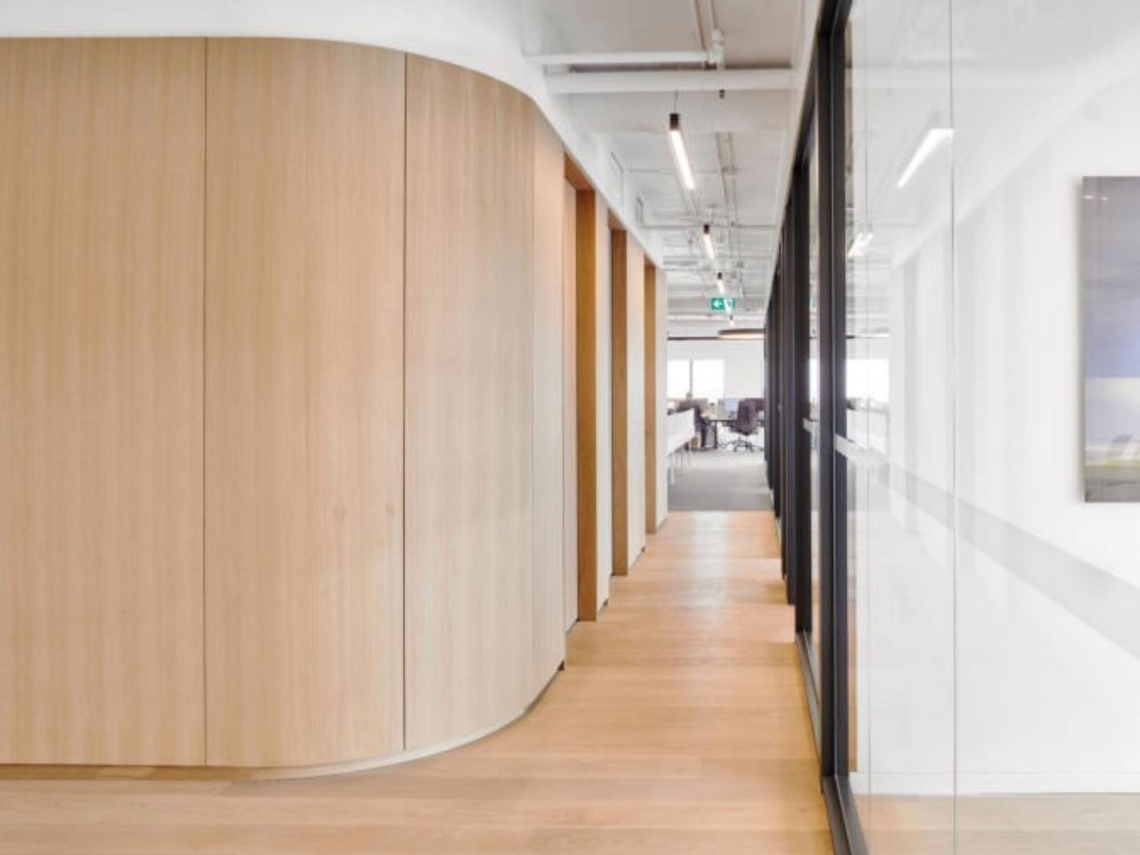 Whilst the interior design incorporates a lot of linear shapes, hallways corners have been softened with curved wood edging that enables clients and employees to flow effortlessly throughout the office. To prevent the decoration seeming stark and cold, the curved wood has been textured to emit varying shades of depth, light and shadow.