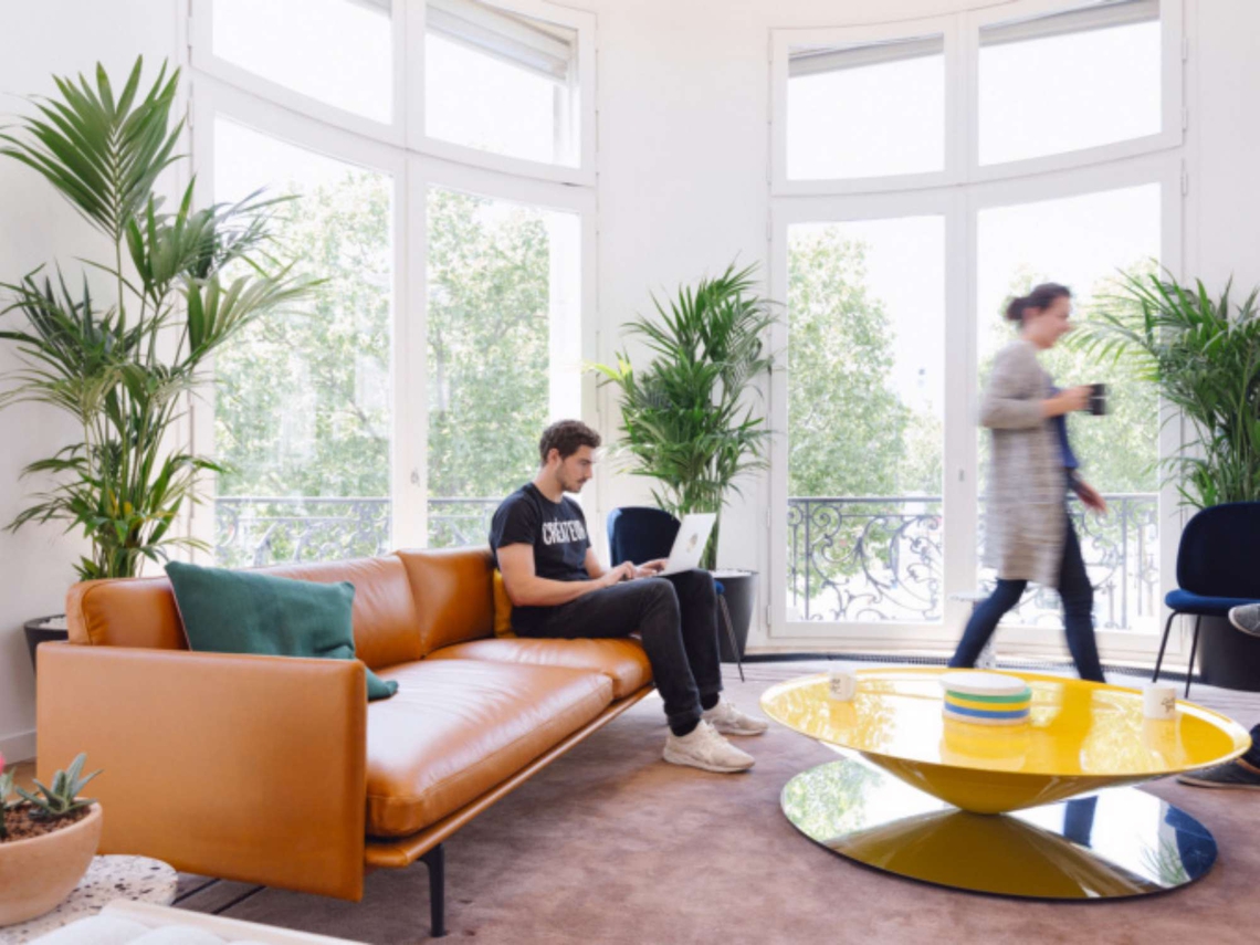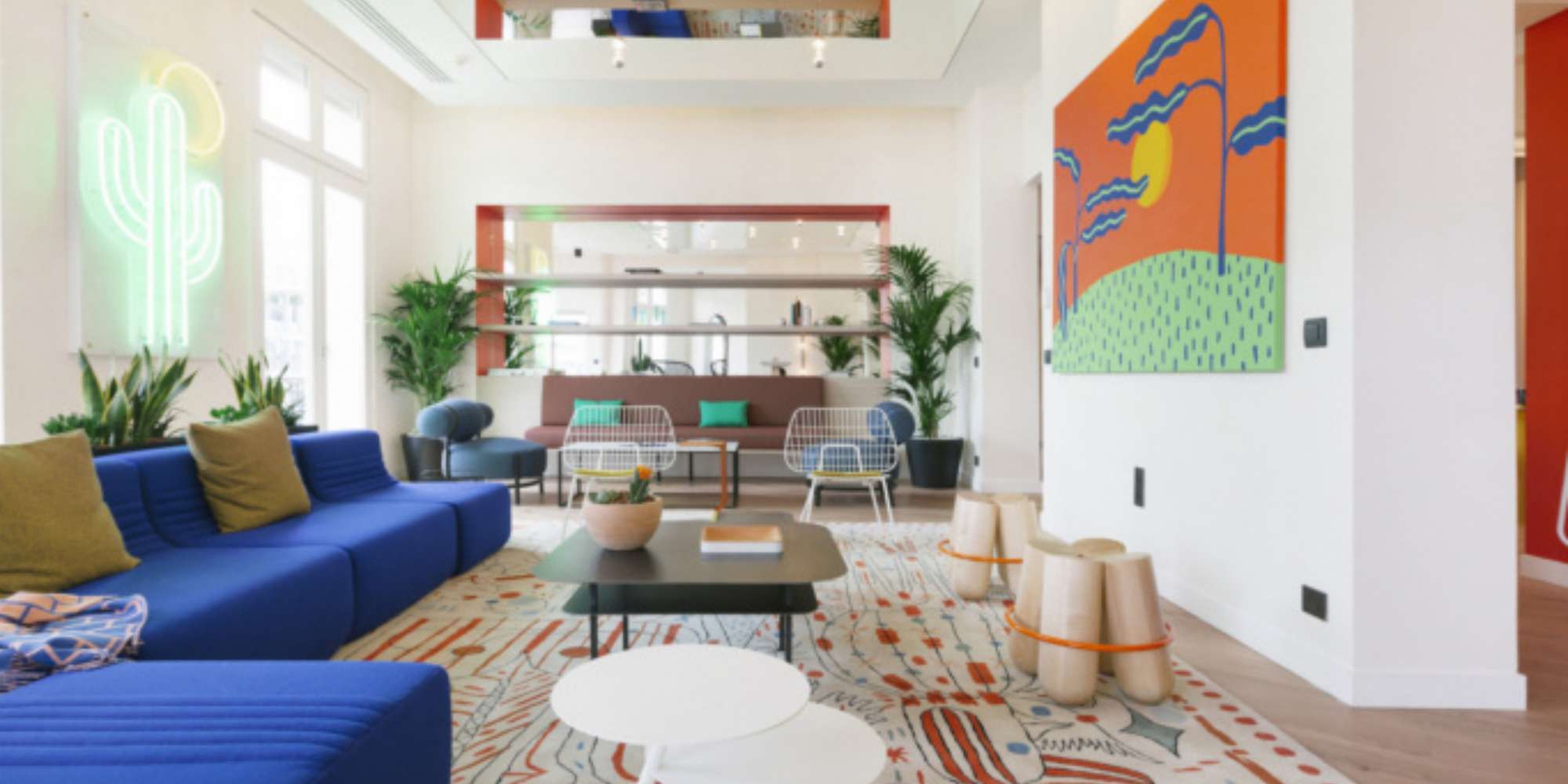 The decoration designed by WeWork is a tribute to Haute-Couture and particularly to that of Yves Saint Laurent. The terracotta clay of the gardens, the painted blue concrete with bursts of yellow, the greenery of the palms and cacti plants; All these colours and materials reference those that the couturier loved in the Jardins Majorelles in Marrakesh, Morocco and have been incorporated into the interiors of WeWork Champs-Élysées.