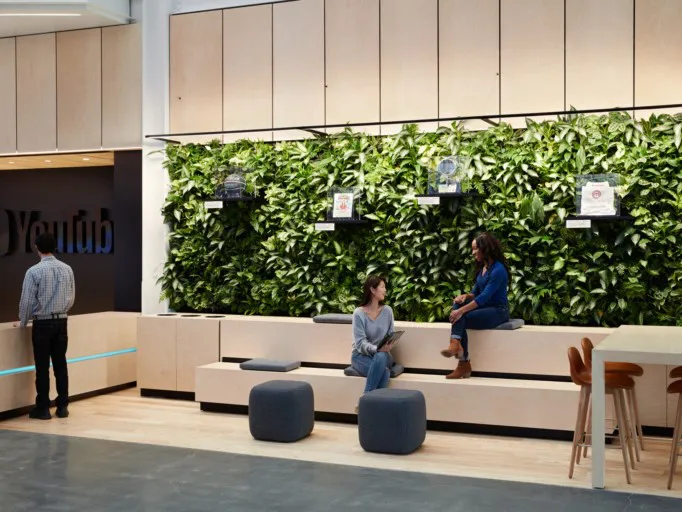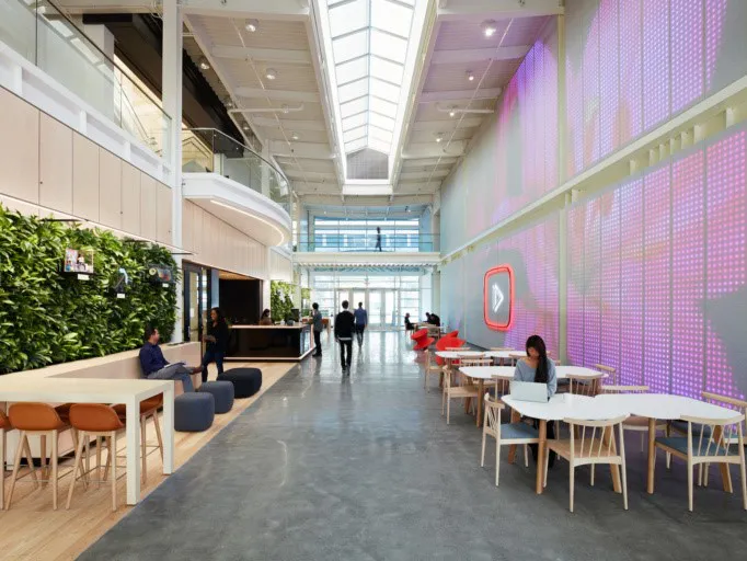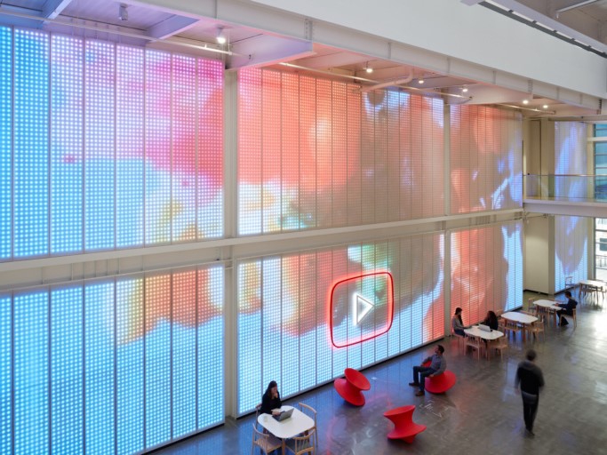 YouTube's famous "play" icon is outlined in neon in the center of the LED wall. The northern side of the lobby is lined with pockets of green wall, stacked wooden benches and high table seating.