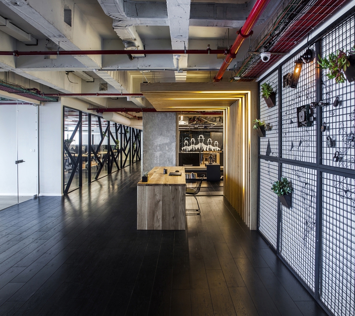 Due to the nature of the cyber company’s operations, the theme was anonymity. This idea was brought to life and materialised via the use of wall art which is locked behind enormous metal nets, wooden planks which cast over glass dividers, optical illusions, misleading walls, repetitive frames and never-ending tables. The colour black is prominent throughout the whole space, allowing employees to complete individual work and quite literally disappear into the darkness of anonymity. Images taken from Office Snapshots
