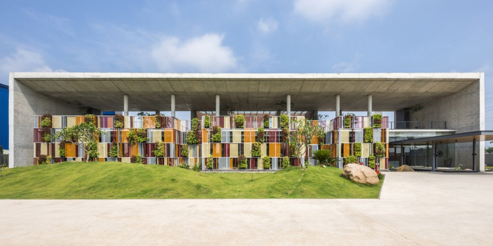 Designed to combat the extreme heats of Hanoi’s sub-tropical climate, a facade of perforated metal in varying colours prevents the need for blinds or further sun-shading and adds a visual point of interest, along with planters placed strategically along the grid. Additionally, a large concrete canopy shelters the main building of the campus, which has a number of shaded external spaces. No fewer than eight courtyards are filled with a mixture of paving, plants and large rocks, with a concrete grid above casting a changing pattern of shadows across the space throughout the day.
