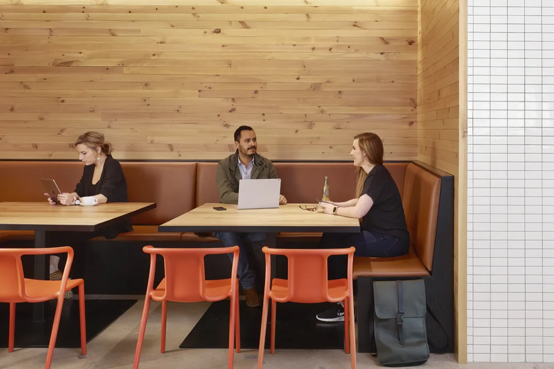 High-backed booths, for example, are perfect for informal chats that don’t require booking a meeting room. Amber also points out that while tech-enabled collaboration spaces are essential, so too are tech-free ones. “These spaces prioritize acoustics, privacy, and comfort to support in-person conversations.”