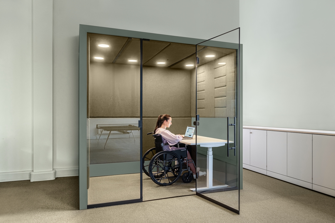 Meet Portals Studio! This accessible and hugely customizable meeting booth is the space-efficient answer to those small meetings or private working requirements. Modular adaptability is inherent, allowing for quick adaptations of the space from single person private booths to collaborative meeting spaces. Designed with accessibility in mind, Portal Studio not only has step-free access and an accessible door width, but the roomy internal dimensions ensure it can accommodate a wheelchair turning circle.