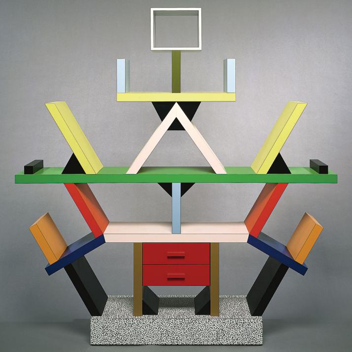 For the next four years, until Sottsass unexpectedly left the group in 1985, Northern Italians set the aesthetic tone in a way that had not been seen since the days of Renaissance Florence. Memphis furniture, as can be seen from the image of the room above, was made in unusual ornamental shapes and decorated with outlandish patterns and vivid colours. Every surface was covered in plastic laminate so that it shone. Compared to the monotone and the minimalism of so much modern design it was shocking – and it was supposed to be shocking.