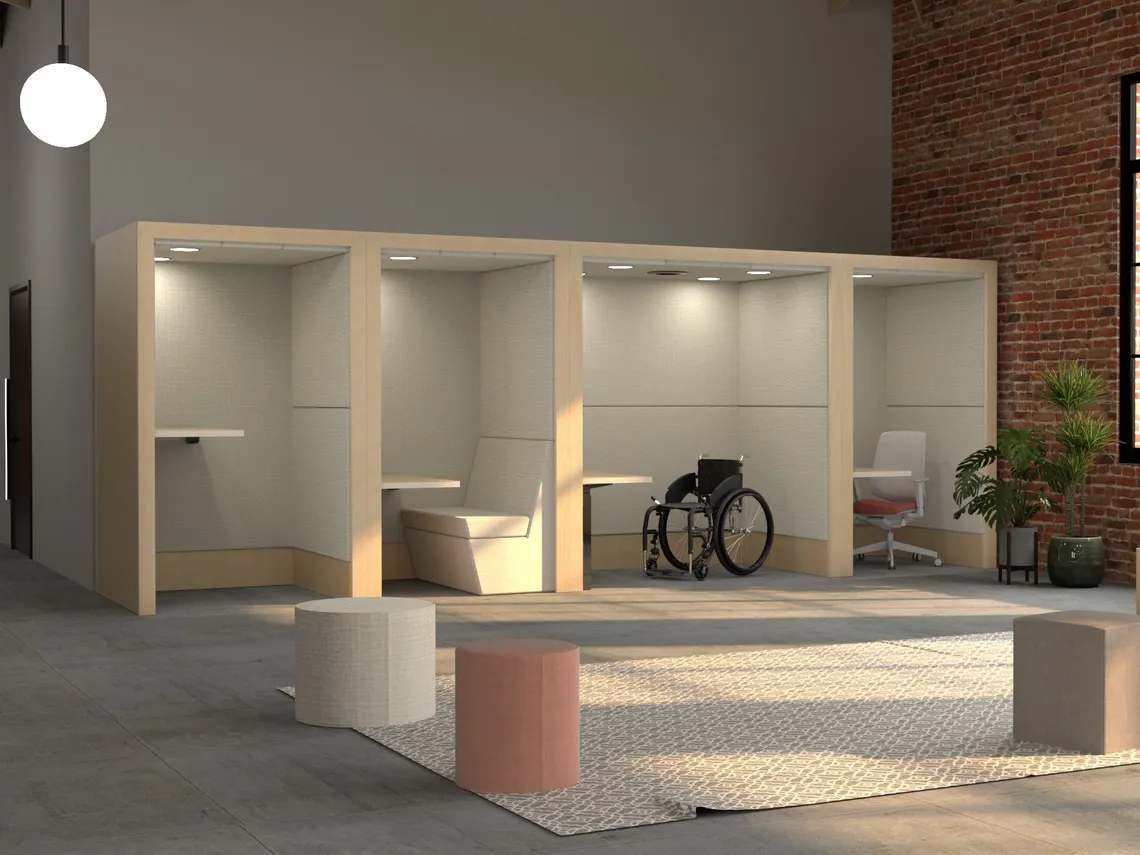 Workplace video booths are deeper than phone booths, which allows the camera to be positioned a comfortable distance away, avoiding unflattering, mugshot-like close-ups. They’re also designed with inclusivity and accessibility in mind. Lighting and interior finishes are chosen to support the visual representation of all people, regardless of skin tone and clothing choice, so that everyone looks good on camera; which helps with self-confidence, legibility and clarity.