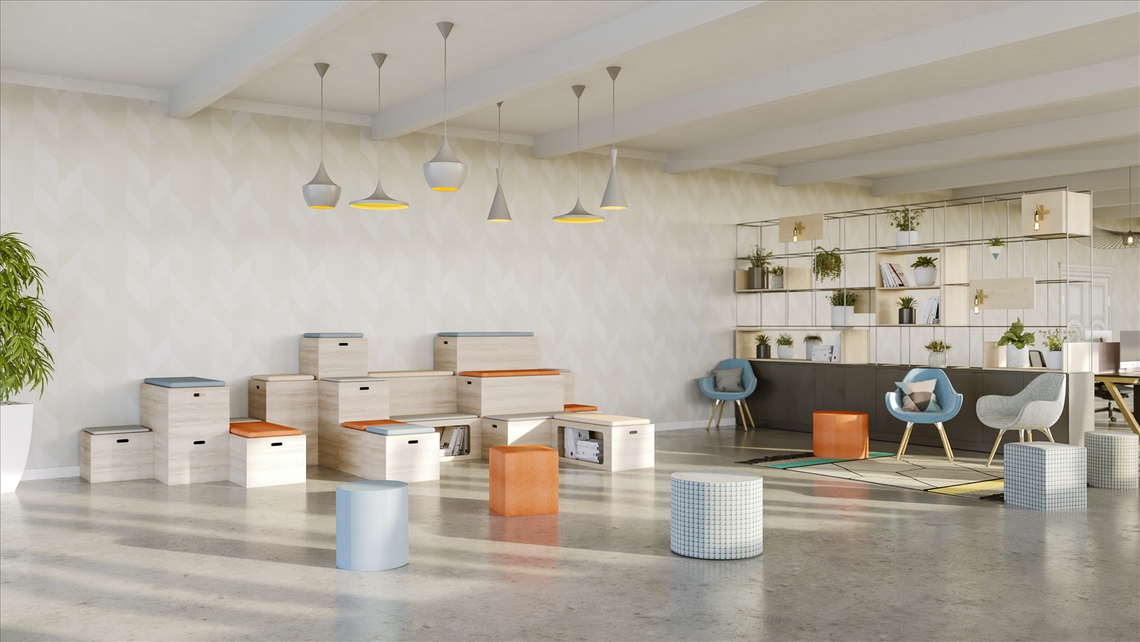 A modern workplace should offer a wide variety of spaces for employees to collaborate in, from large meeting spaces that can accommodate whole teams to smaller meeting spaces for more intimate conversations. It’s also good to offer break out areas, with relaxed seating and coffee tables, for bringing people together informally – our Bleachers system of modular seating helps make a perfect space for some blue sky thinking.