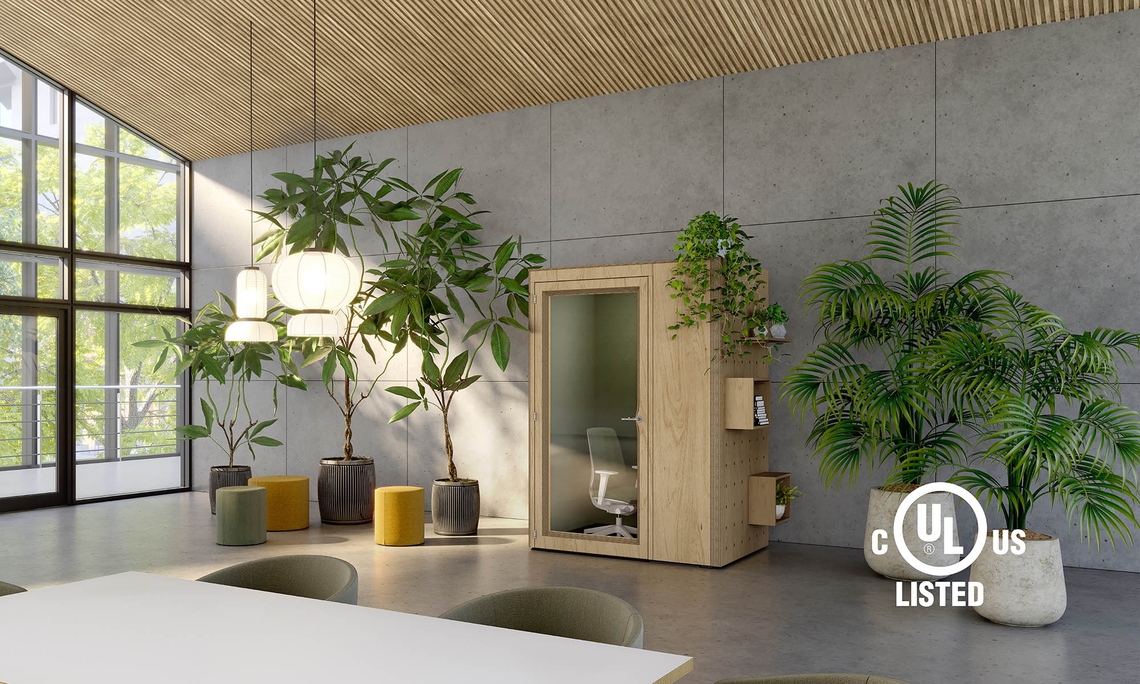 Residence Connect also guarantees a safe and healthy experience for users, with a unique ventilation system that pulls ambient air through the top of the unit at a rate that ensures a full change of air every four minutes. This feature, along with carefully-tested upholstery fabrics, fire safety elements, and a seismically-engineered structure, contribute to the pod’s UL Listing. For extra safety, Residence Connect can be further customized with an air purifying add-on that uses UV-C light to deactivate airborne pathogens and microorganisms.