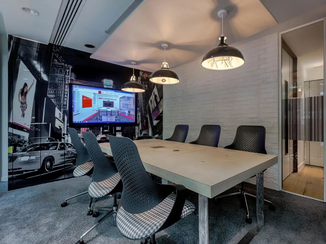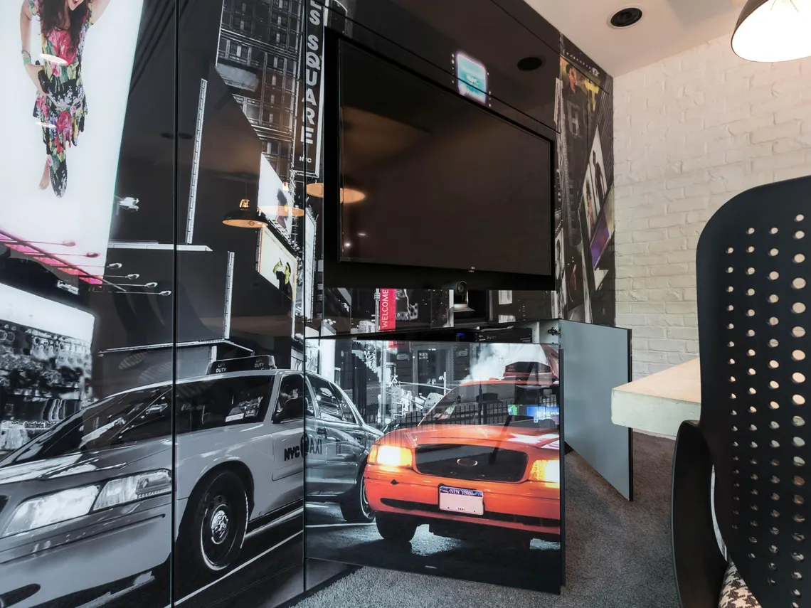 We provided our Mediastor product. A unique and customisable storage wall with creative city graphics used for presenting pitches, storage and more. Mediastor allows employees to hold meetings and presentations with an integrated screen, also supporting audio-visual hardware for video conferences too. All cables and hardware is discreetly contained within the design making this dynamic wall ideal for meeting rooms.