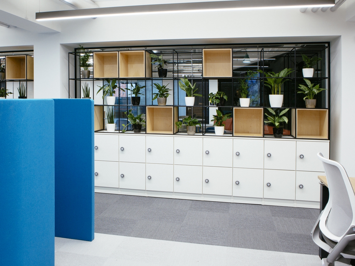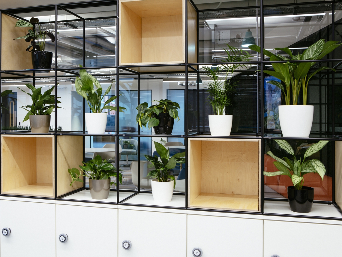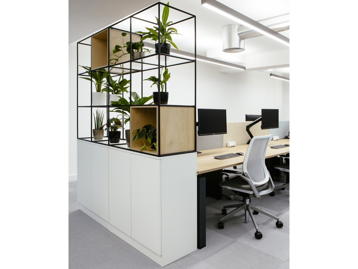 So, the office needed to remain agile, incorporate a variety of zones and have plenty of space for potted plants. The solution to all of these needs? Our Palisades Grid system, which was used to divide up the different zones without blocking the sunlight and also to house and display plants in a calming, harmonious way that contributes to the healthy atmosphere.