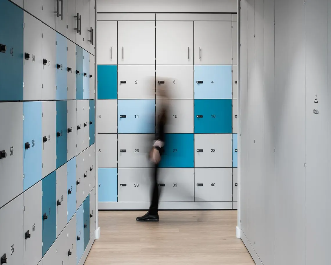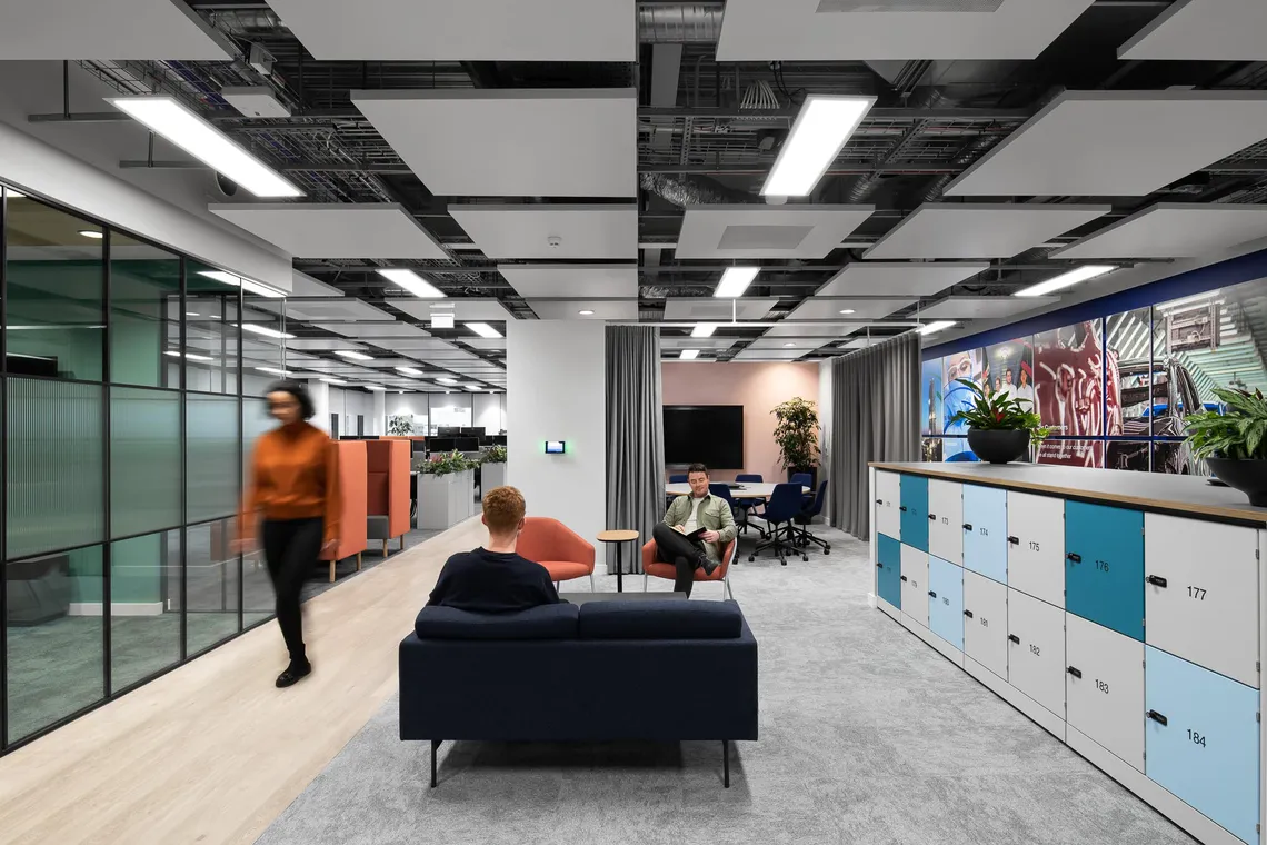Based around a neutral and homely palette, the design also incorporates splashes of bold colour choices and full-wall graphics based on the outputs from the staff engagement sessions, giving the space an individual identity and a vibrant feel. As part of the vibrant bursts in the office, our HotLocker product provides fully customized, personal storage in several configurations throughout the space. Adjacent to one of the breakout zones, a run of colourful lockers reflects the colours of the bold graphic behind. Not only are the colours beautiful, but they make it easier for employees to remember which is their locker. Elsewhere in the space, the lockers have been built-in alongside our Storagewall to give a totally bespoke look and feel, whilst still retaining the benefits of a fully modular system.