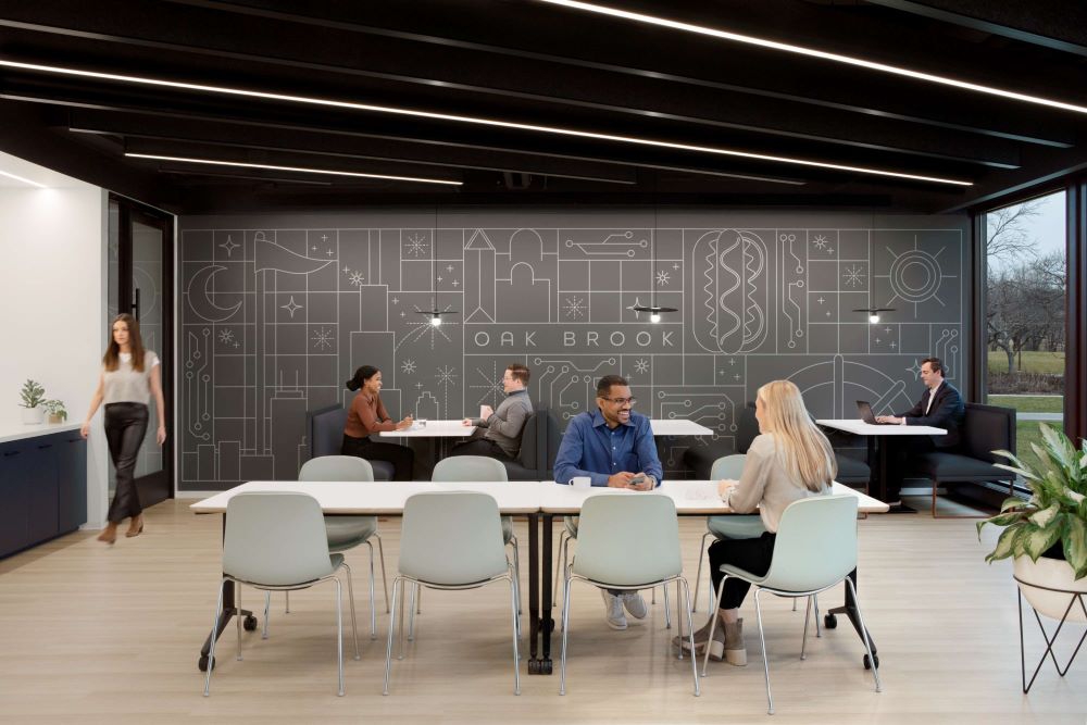 The cafeteria area is a place within BDO’s Oak Brook Office for employees to network and make connections away from the pressure of a day-to-day workplace pace. Establishing a strong connection with both nature and culture, the environment is a soothing space to disconnect or work with an accompanying café white noise. The characteristic showcase of a beautiful surrounding landscape is consistent through this area to great effect, and this is supplemented by the connections made with the local culture. A wall mural with a graphical representation of the location’s geographical positioning works to relate employees to the local community and build an emotional connection to the setting and neighborhood.