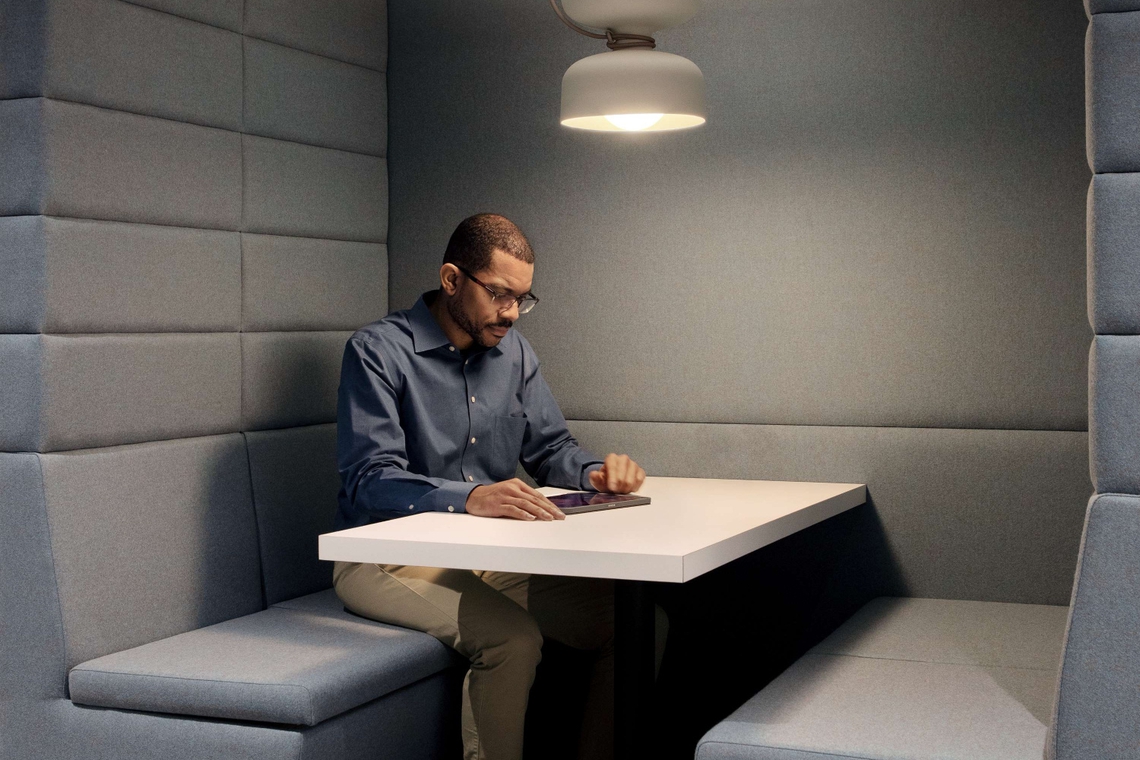 Other types of spaces are provided for employees including small meeting booths and touchdown spaces, open plan café areas and acoustic pods for privacy. Providing a space especially for small meetings, Spacestor’s Classic Railway Carriage was included as a fundamental site for collaboration in the scheme. Customized in a soft grey upholstery with woodgrain cladding and a white pendant light, the product boasts a subtle modularity, whilst being fitted neatly below a bulkhead for an integrated look.