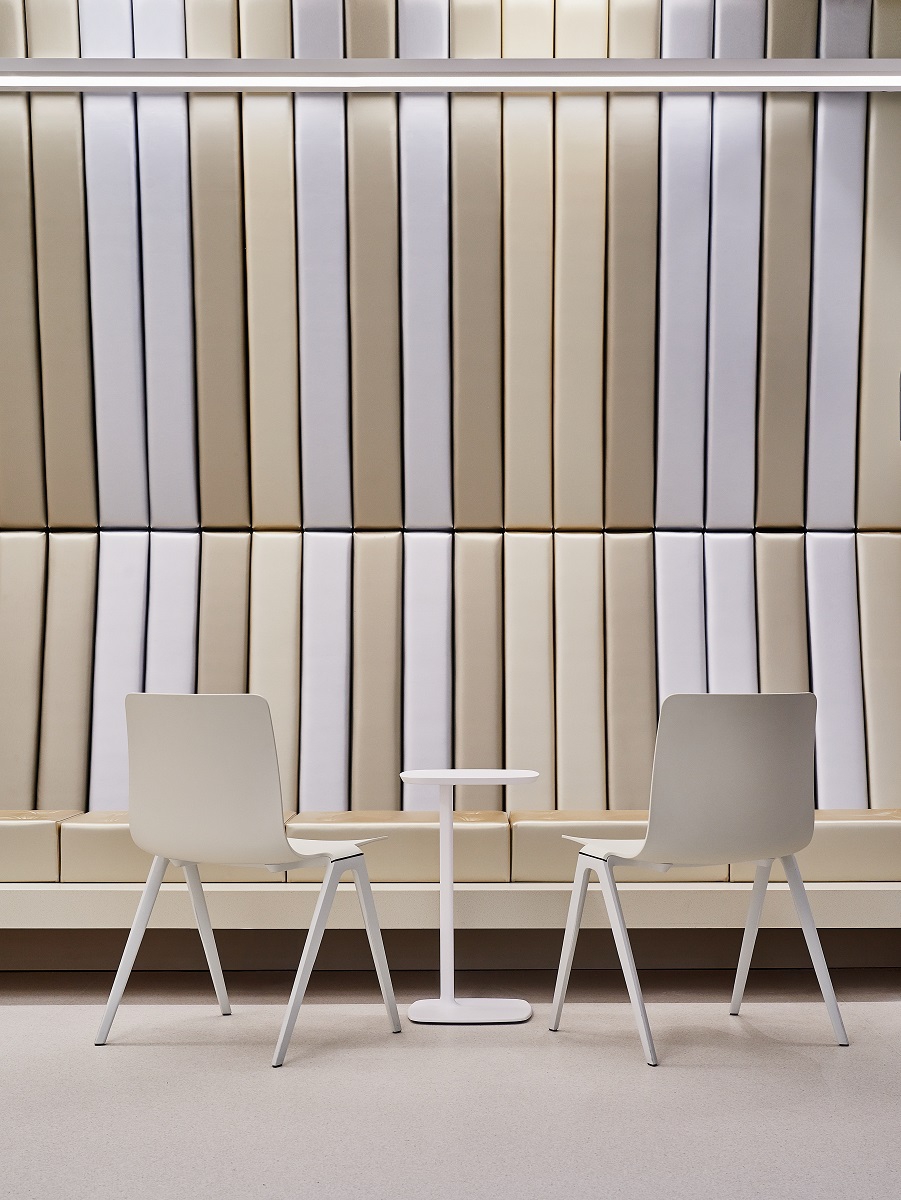 The office space, bright and soft with muted tones and acoustic provisions made to enhance experience. Sleek Storagewall and personal, tech-integrated Hotlockers, to give employees space in a hot-desking, fast-moving society.