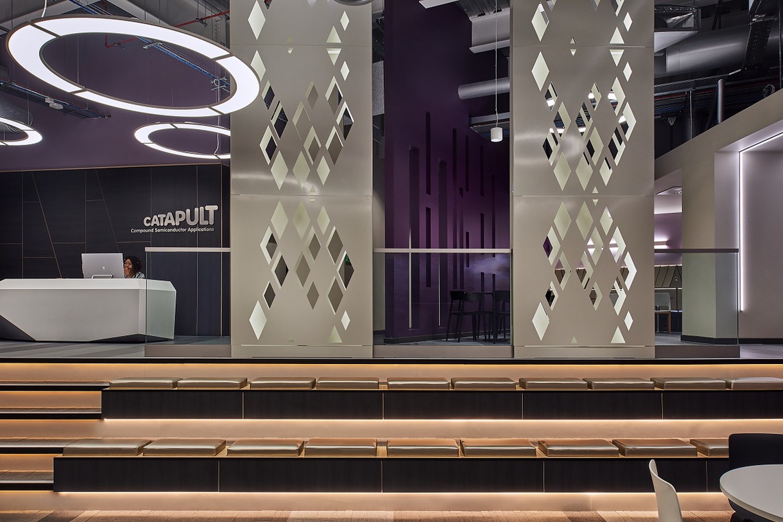 Glamourous at the outset, but with a functional focus, and a distinct consideration for employee experience. Catapult partnered with Montieth Scott and Rhino Interiors to craft a highly luxurious environment including an auditorium and a people-centric kitchen area. Stunning and impactful, the company’s new experiential space in Newport is central to their brand, serving to magnetize the hub, attracting employees; to meet, greet and network, with unprecedented results, allowing them to remain experts and innovators in the industry.