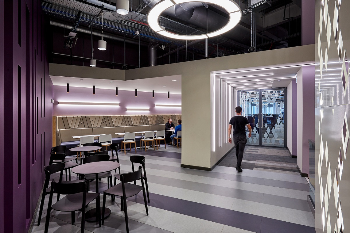 For many in the return-to-workplace world, social interaction is more important than before. The kitchen area provides a site for this social communication to happen in a relaxed and highly prosperous setting. Rich, purple coloring with eclectic lighting and a themed floor design, enabling clear but not arbitrary zones to be created.