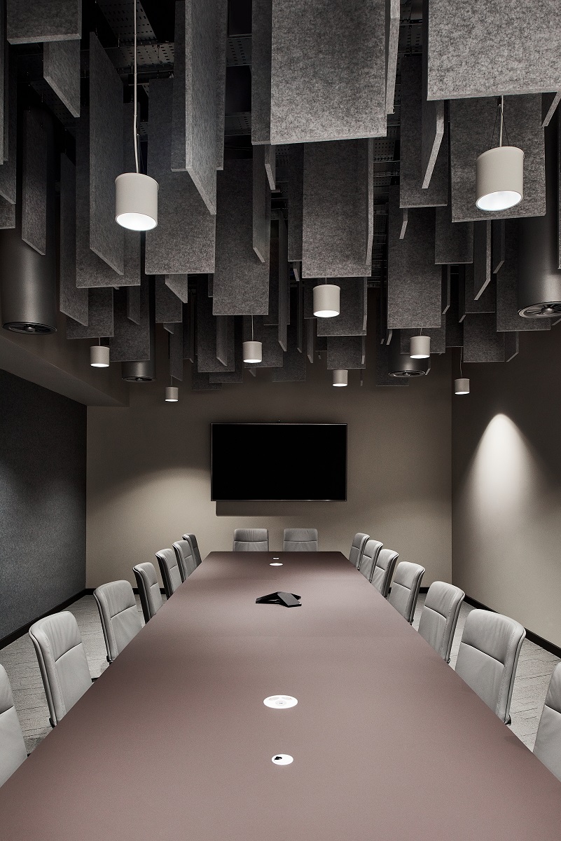 Tungsten toned, metallic upholstery, monochrome and soothing give an overall calm and premium vibe. Contrastingly, enclosed spaces in darker, earthier tones with mottled greys and browns, a dramatic environment for focused work and private meetings.