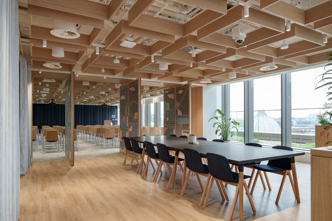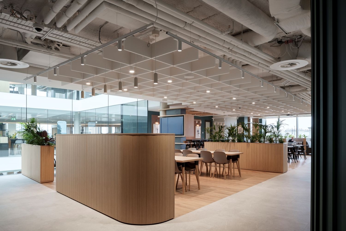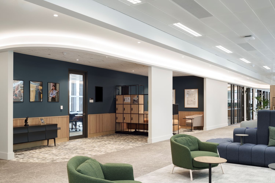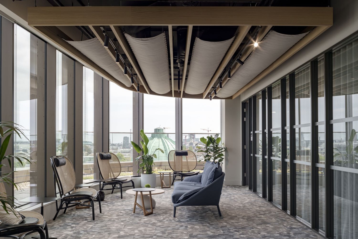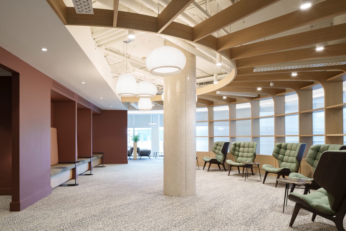 A stylish and modern, yet professional design aesthetic is present in this space, with muted colors present throughout and curved walls which contribute to an organic feeling. The workspace flows and has an open and airy aura, which the curved cove lighting highlights. The ceilings have been carefully considered to merge cohesively with the various areas. One space has a designed acoustic panel ceiling with wavy cutouts, whilst decorative wooden grid and beam structures are used elsewhere, to draw attention to the beautiful fabric of the building.