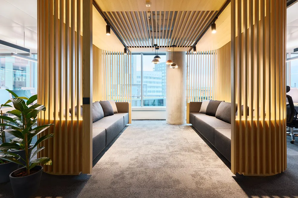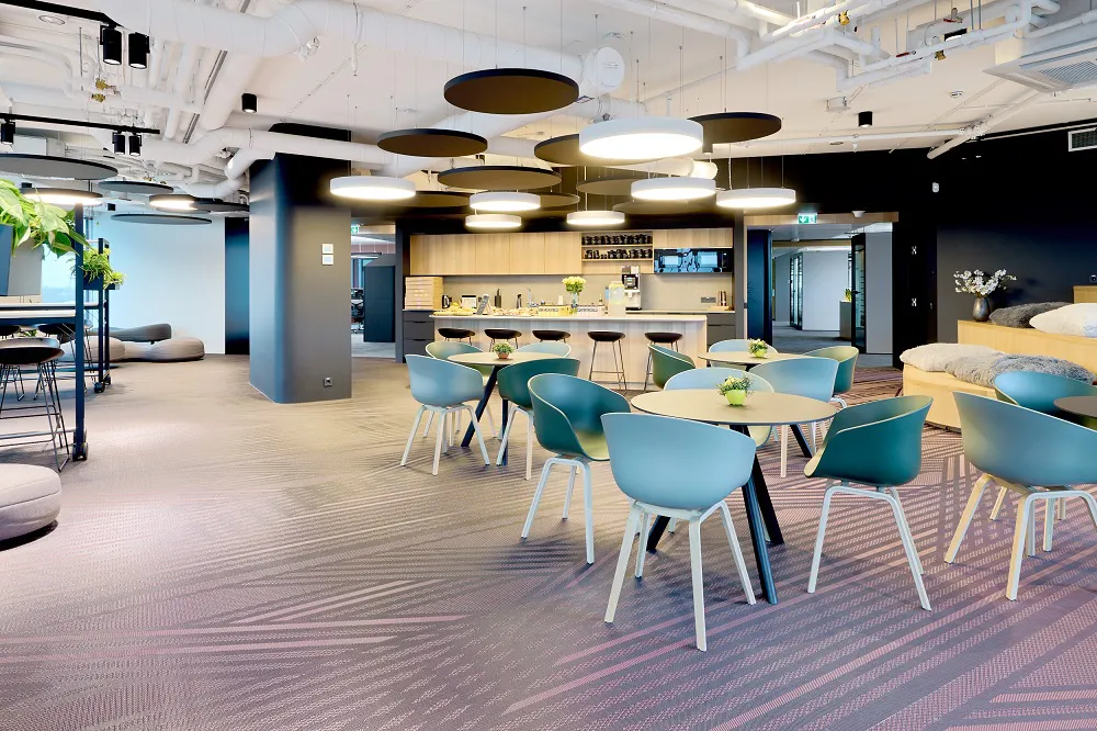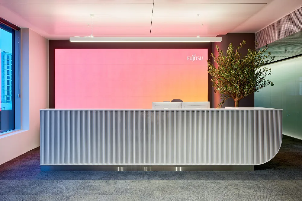 The innovative and distinctive design reflects Fujitsu's brand identity while incorporating sustainable and employee-centric elements. This modern workplace interior sets an example of bold office design, promoting productivity, collaboration, and employee well-being.