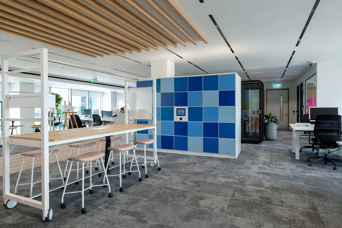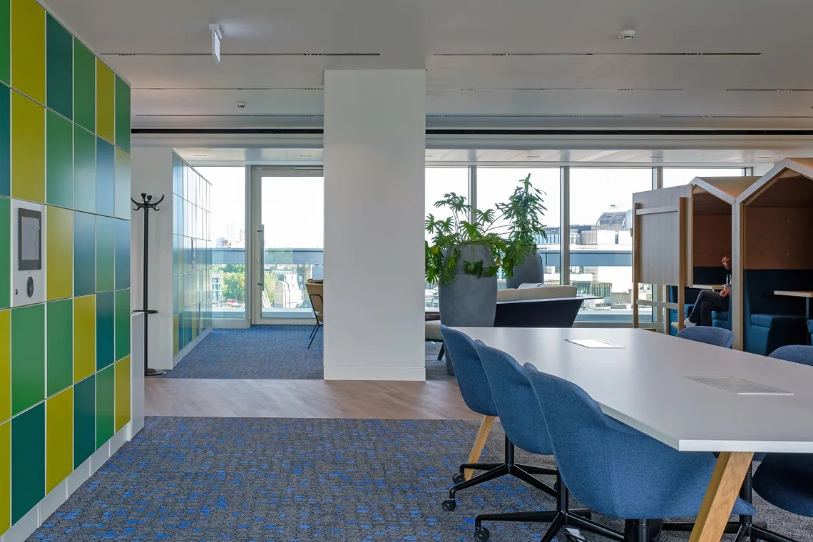 Large, floor to ceiling windows illuminate a spacious office where vibrant HotLockers in shades of green and blue provide a storage solution for employees. The agile system enables them to make choices and gives them autonomy, allowing the to adjustment of experience to align with needs.