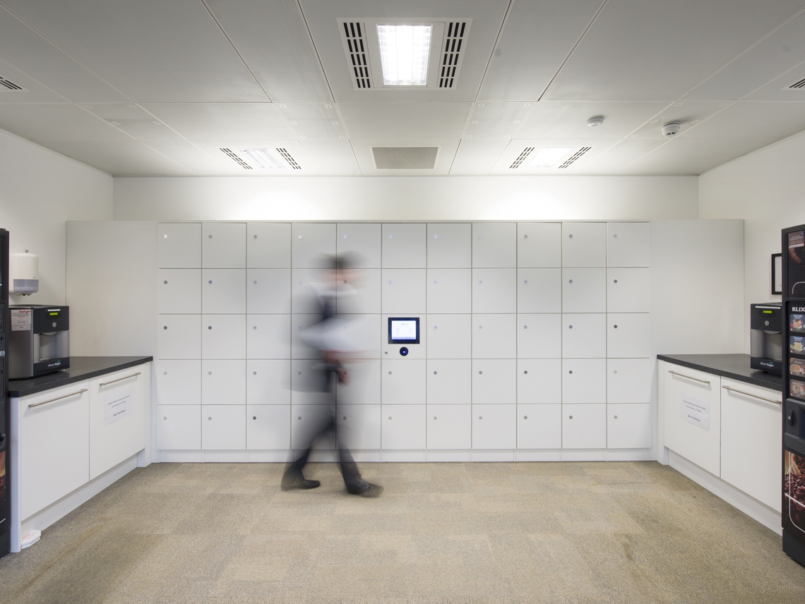 The HotLocker system allows staff to use whichever locker they want, whenever they want – they simply choose one from the self-service terminals and then unlock and lock it using their phone, their bank card or even their oyster card. Furthermore, it also comes with integrated reporting to keep track of who’s used every locker. It’s a highly dynamic and future-proof system, and perfect for a multinational like Fujitsu that wants to provide an integrated, intuitive system for its permanent and visiting staff. In Baker Street, we installed a number of banks of HotLocker lockers in the shared refreshment area and another leading into the open-plan workspace, where they also functioned as a sleek, minimalist zone divider.