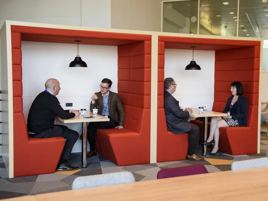 At another of the client's locations in Kent, there has been a focus to change the feel of the office, from one of private offices and separating employees to that of a collaborative and agile working environment, to help support the departmental neighbourhoods. Working with Insightful Environments, we provided our Snugglestors to the work café area, a breakout space designed to provide relaxation for the staff but also offering further collaboration spaces. The Snugglestor provides a solution that is both innovative and space-saving. It’s an upholstered seating alcove that can serve as an impromptu meeting space as well as a quiet thinking area.