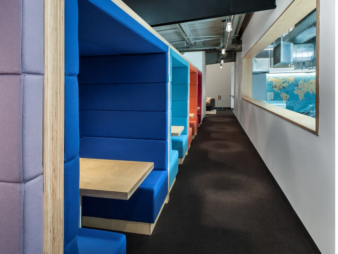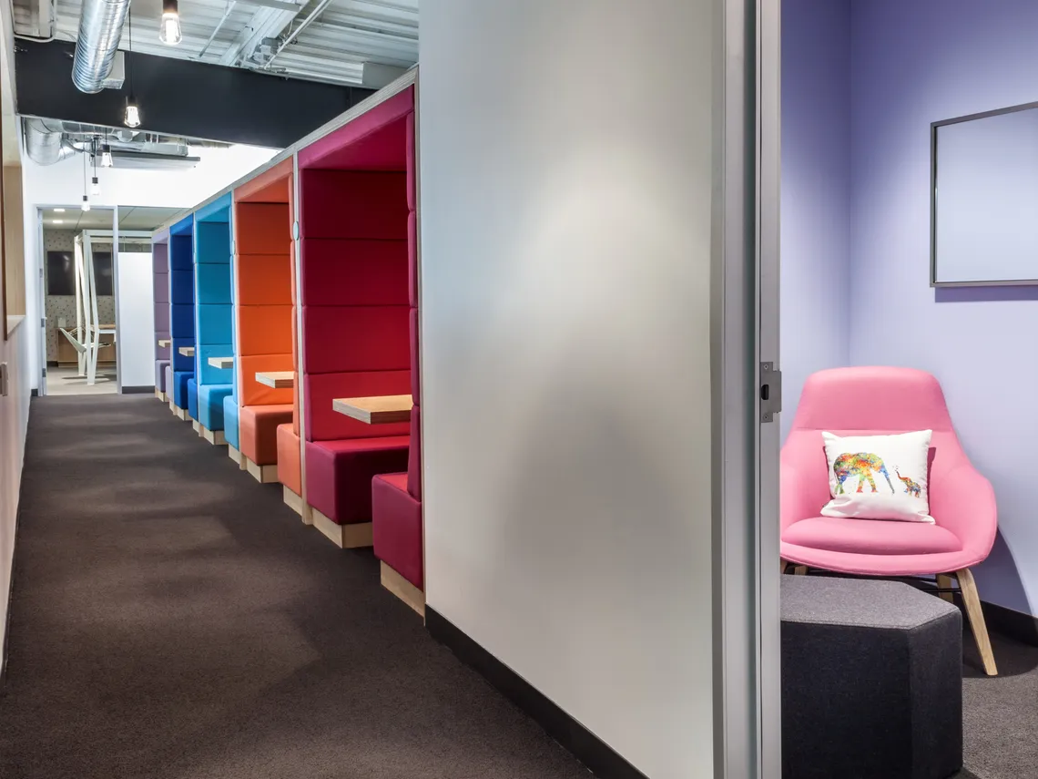 The work space was designed specifically to have a layout which encourages employees to move around frequently throughout the day to help promote healthy habits. This was achieved by having open desks and meeting rooms located furthest from the rooms designed for relaxation , as well as having additional work spaces which allow workers to vary their locations throughout the day. We provided acoustically enhanced quiet working pods – our Railway Carriage – in array of vibrant colours to reflect their vibe. Their aim in designing this workspace to help employees be more energised and focused has evidently been achieved as one employee says “the layout of the office naturally encourages people to move around a lot on a daily basis”.