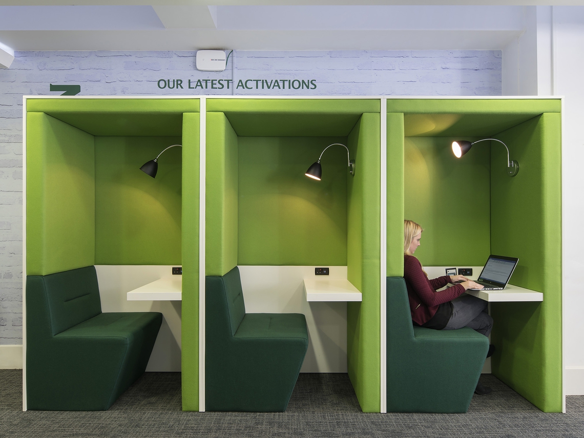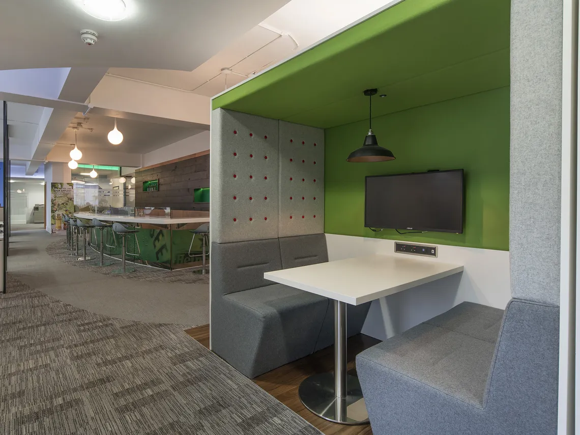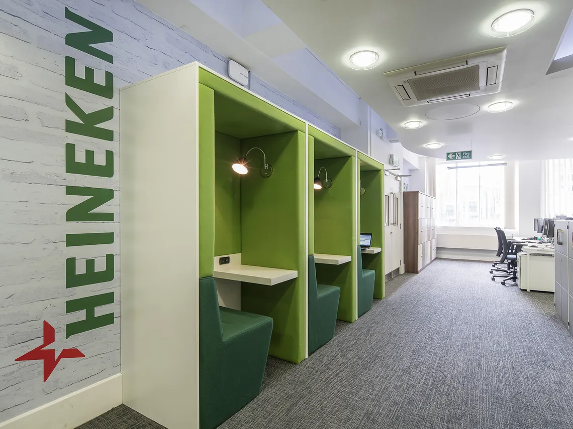 The most important change, they discovered, was that the design should be more agile and should offer a wider variety of smart working spaces to suit different tasks, personality types and approaches; some things are best done out in the open, whereas others require a little more privacy. As such, Spacestor provided a run of matching Phonebooths for focused individual work, as well as 4-seater and 6-seater Railway Carriages for smaller groups to use; all upholstered in harmonious green Heineken tones of course. The result is a more sociable, interactive office in which every member of staff can find their happy places.