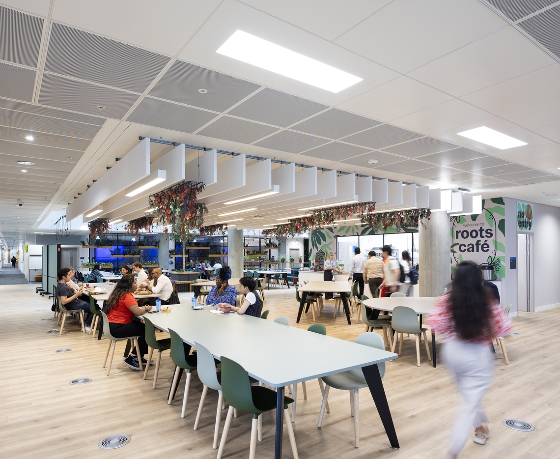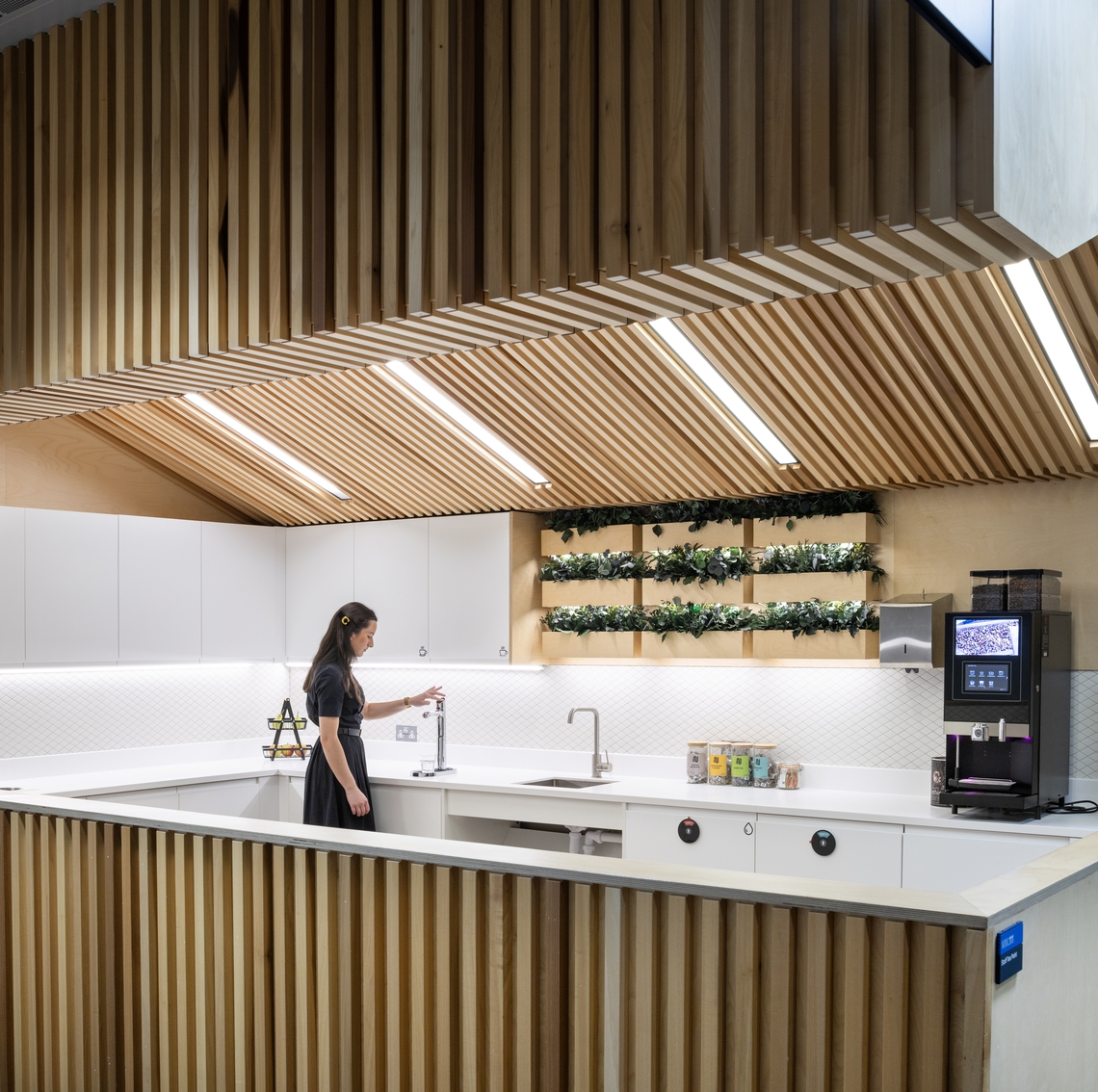 Wellbeing is a central theme to this space, with a full suite of dedicated rooms including a fitness studio, prayer space, wellbeing room, and mothers’ room. A large canteen and kitchen provide a social heart, while well-placed Teapoints allow quick breaks without adding distraction to the workspace, with a warm wood feature ceiling and clean white tiles and worktop giving it a comfortable and homely feel. The positioning of these two spaces makes refreshment easily accessible at a central location, whilst keeping noise away from focus areas.