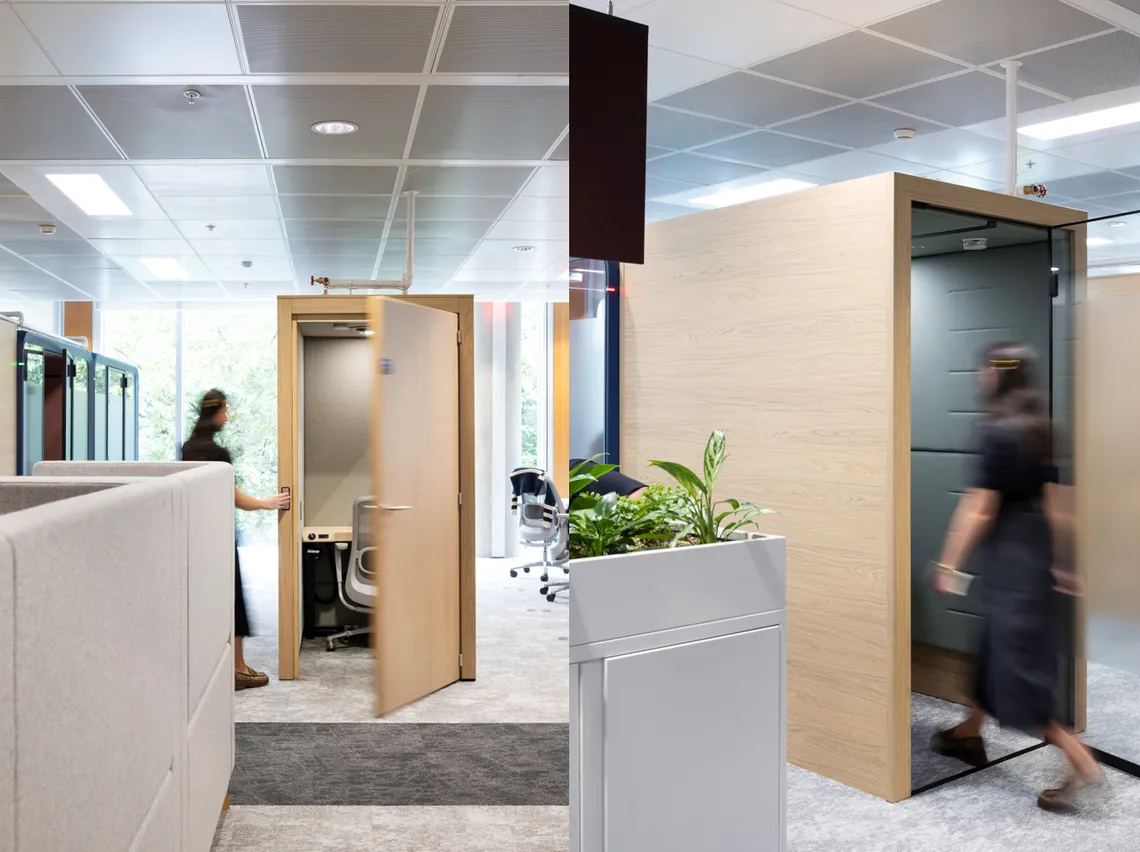 The floorplate includes a collaboration zone designed for smaller group sessions and agile teamwork. Alongside this, a dedicated pod hub provides private, tech-enabled spaces through Spacestor’s Portals Connect and Residence Connect booths. These create enclosed settings for video calls and focus work, reducing noise across the office. The Residence Connect booths are fully accessible, equipped with push-button entry so they can be used by everyone, designed and built from the ground up to enhance video calls.