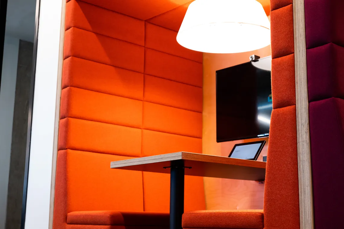 Working with the creatives at Workplace Creations, KGO and Jefferson Group, we provided several different products to the design. Six of our Railway Carriages and Portals are built-in to the side of the central walkway, providing convenient collaboration spots close to the workstations. Over against a traditional meeting room, the Railway Carriages are a much more efficient use of space, as well as providing the benefit of finish customization in the upholstery and cladding, whilst still giving the needed functionality of screens, power, lighting and charging.