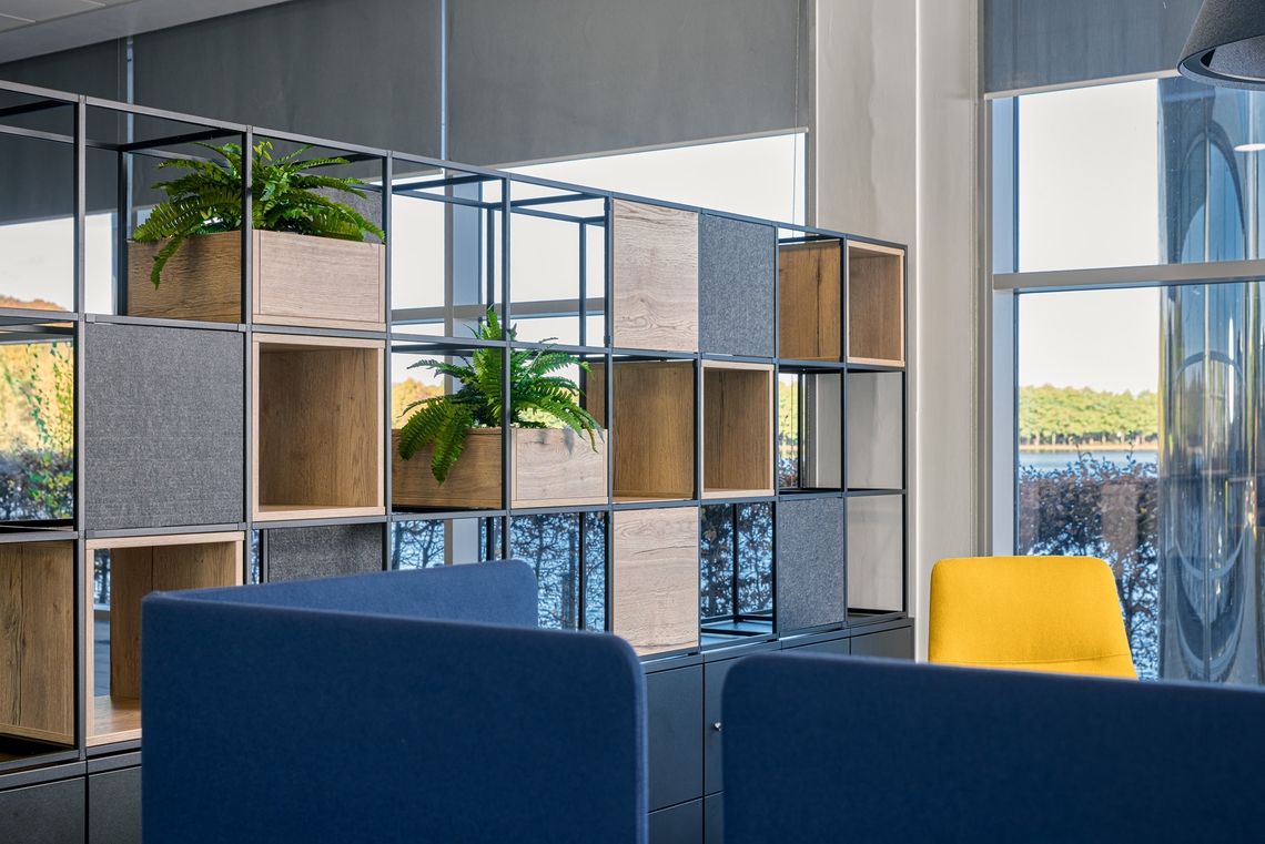 The rustic wood grain finish chosen on the planter boxes, incorporating biophilia through the Palisades II design, creates a contrast with the charcoal-coloured acoustic panels. This aesthetic not only fashions a modern look but also fosters an inviting atmosphere, particularly as it pairs harmoniously with the green and blue tones of Keepmoat’s colour scheme, which is integrated through branded elements around the office.