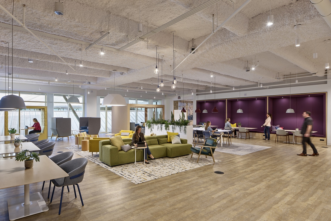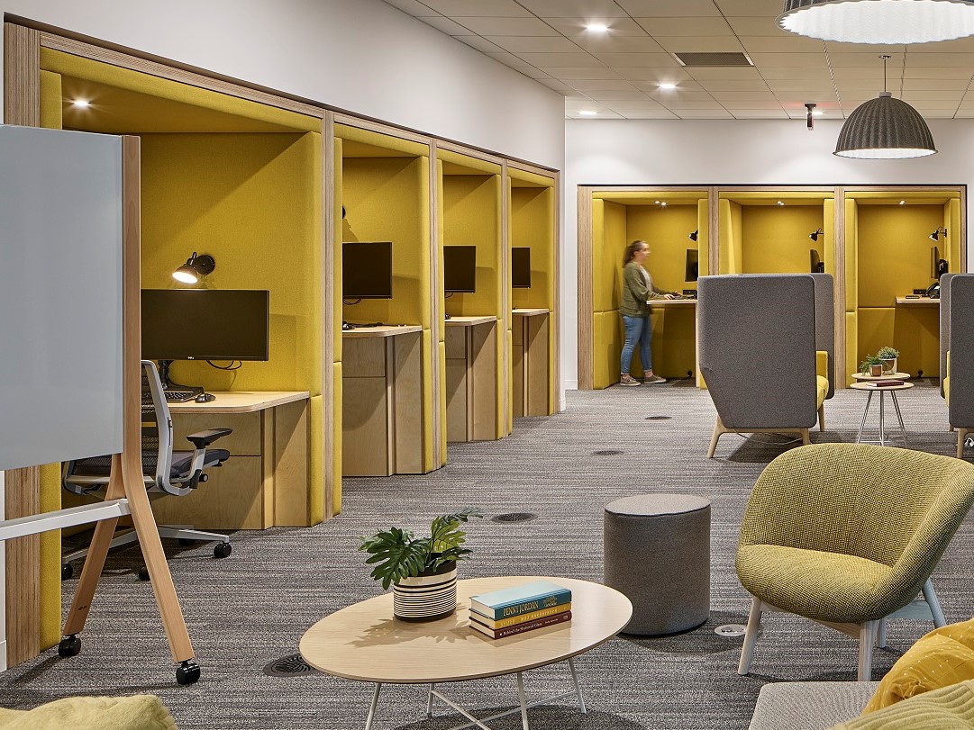 Whilst collaboration is a key part of a lot of the roles fulfilled at the Westlake location, employees still need touchdown spaces where they can be fully focussed and alone. Being upholstered on three sides, our Portals booths give the much needed acoustic privacy, without being totally enclosed behind a door, and disconnected from the buzz of the office. Employee health and wellness has been considered at every step of the design, and to allow for longer periods of comfortable use, the desks have sit-stand functionality, and space to wheel in an ergonomic task chair.