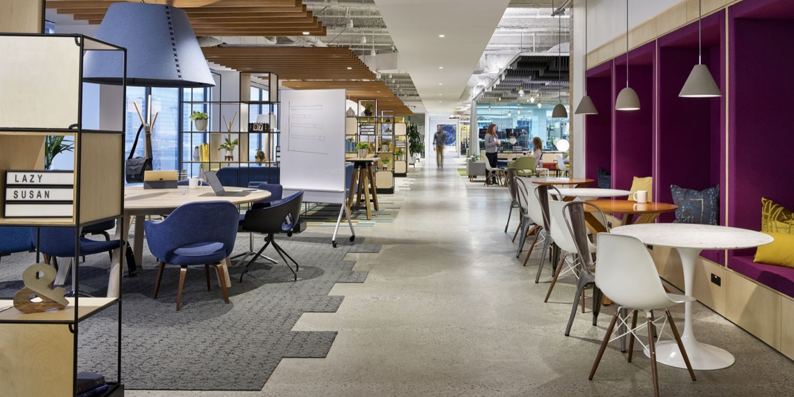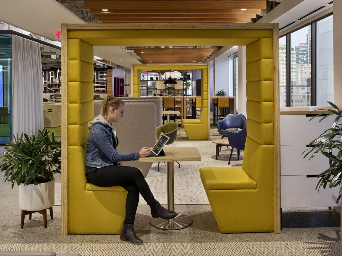 Of particular interest is how a variety of our most popular products were used in innovative ways, making good use of their adaptability and agility. For instance, a run of mauve Snugglestor seating areas has been built into one wall, and each is combined with a table, some chairs and a hanging pendant light to create a space of its own for small meetings or relaxing breaks.