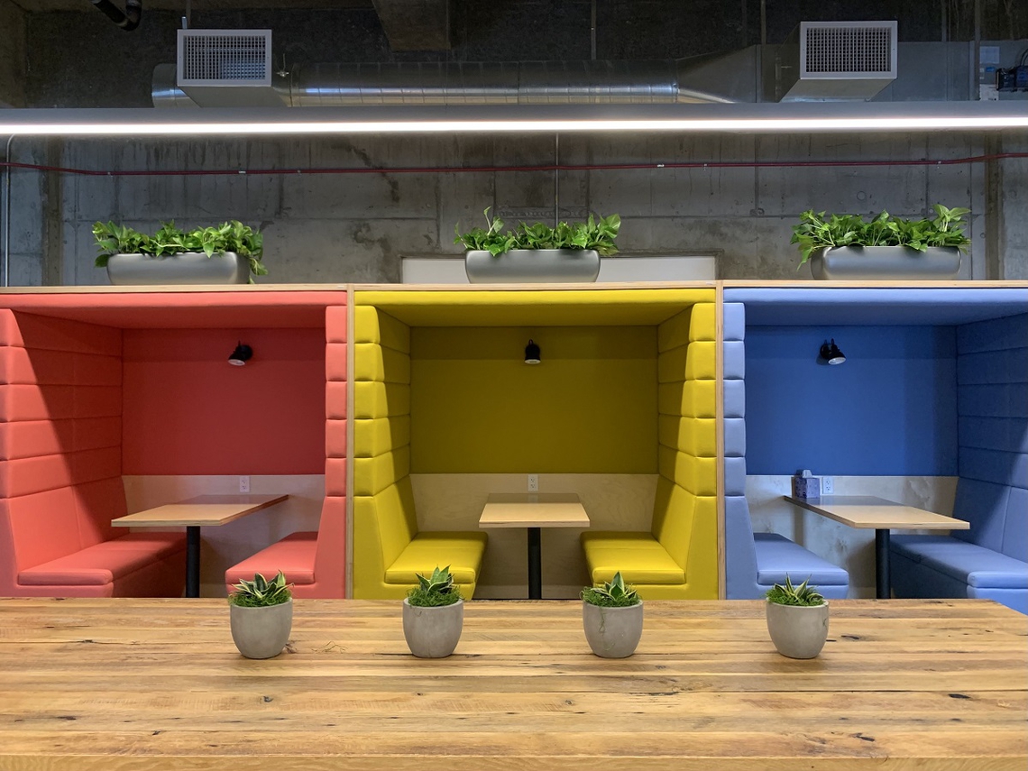 For their downtown San Francisco HQ, LOB asked innovative workplace designer, Kelly Robinson, to create a brand new look for their collaboration and open office spaces. Focusing on bringing the full spectrum of color into the design, we worked with furniture dealer Pferred to provide six of our Railway Carriage office booths in a soft palette of muted upholstery tones, complimented by the biophilic look of the lacquered plywood cladding.