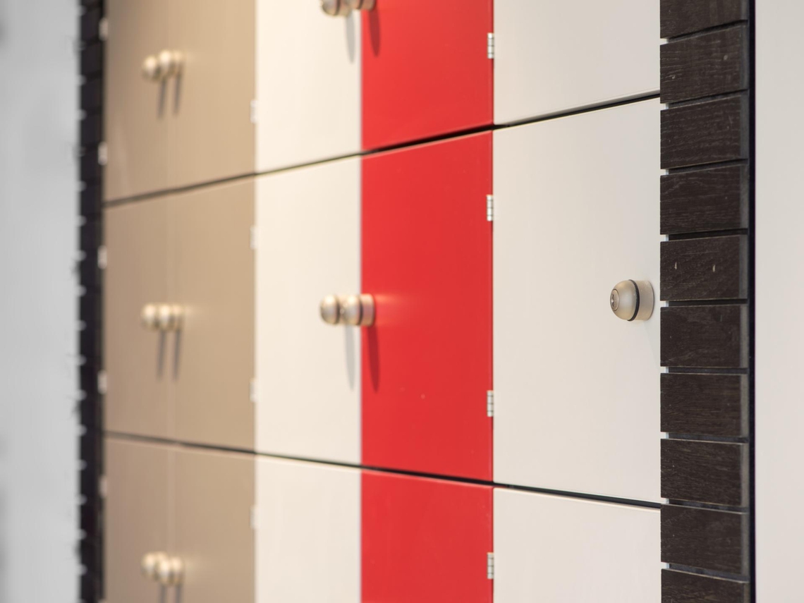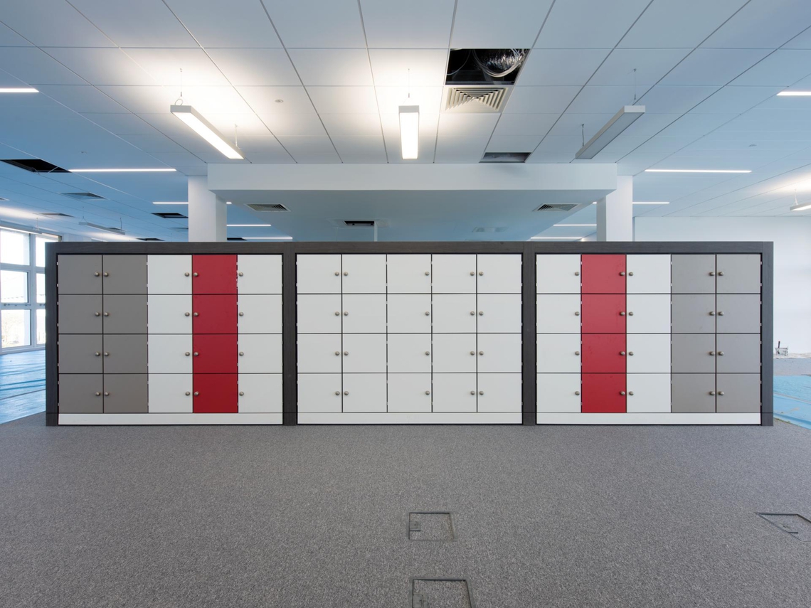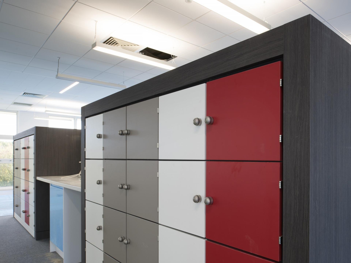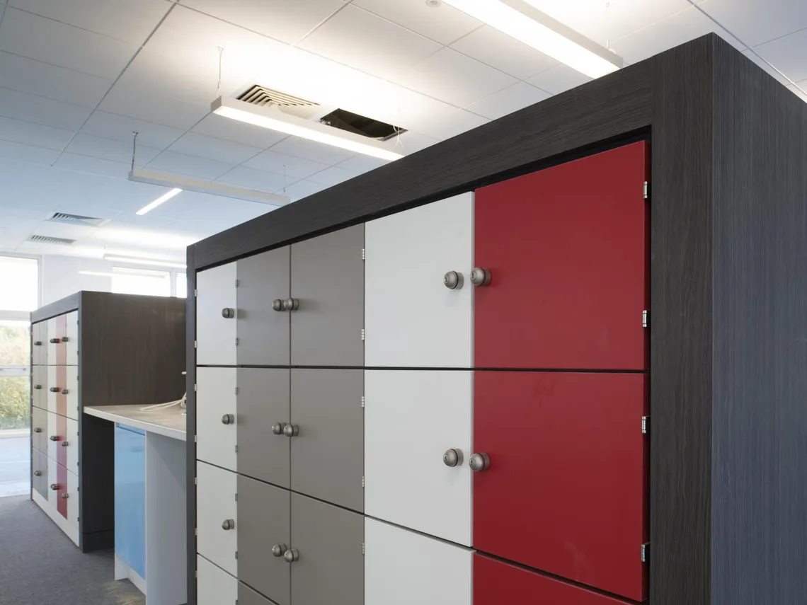A bespoke storage solution combining style and practicality was the order of the day from this manufacturer of medical diagnostic products. Instead of hiding lockers away, this client wanted to show them off as a centerpiece of the office. Working alongside architect, C2 Concepts, we manufactured the joinery surround to their exact specifications, installing a bank of HotLockers with space in the middle for a printer. Clever use of color ensured a classy finish, and elsewhere in the office, we were able to provide matching storage for coats. As usual, Spacestor completed this project on time with a result of a stylish storage system to be proud of! Click here to contact us to find out more!
