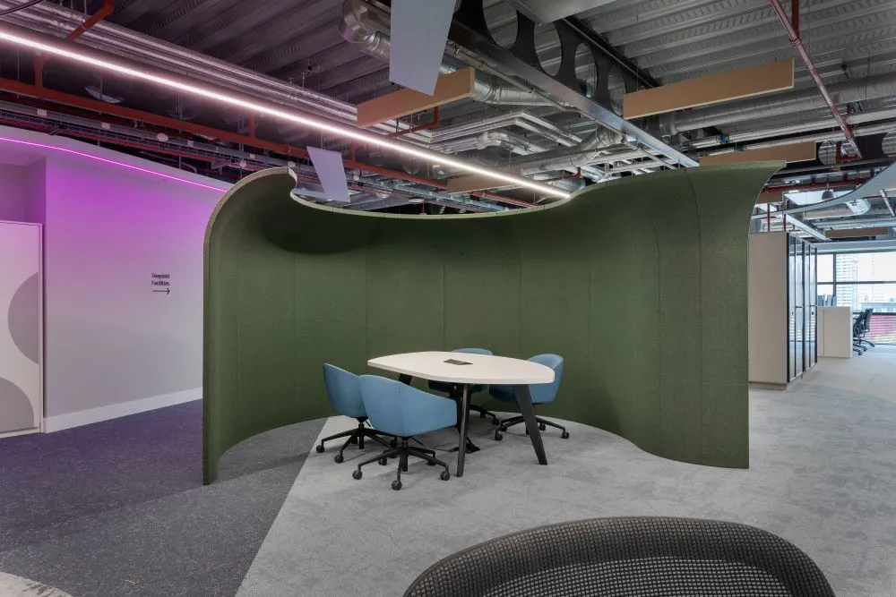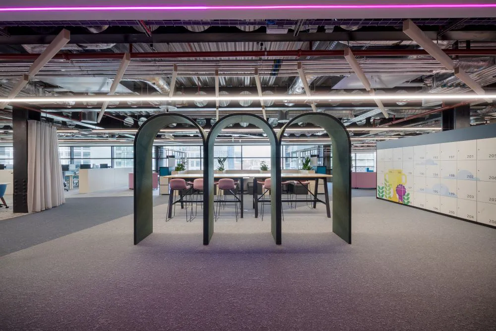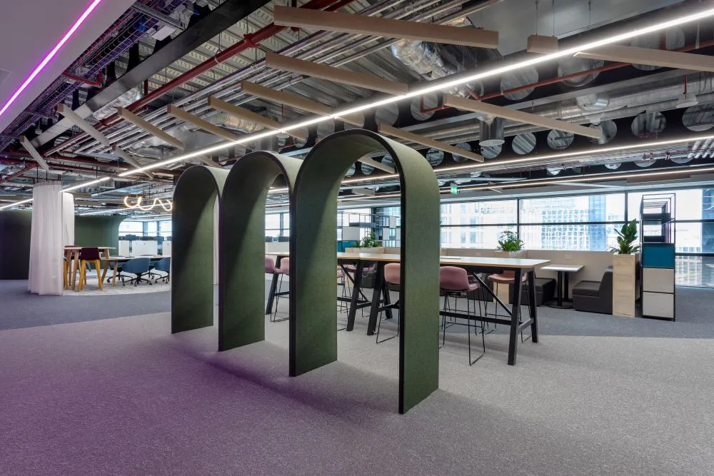 Organic curves and arches help to soften and zone the vast floorplate. They appear on the flooring, lighting, free-standing furniture, and meeting spaces and have even been used to create an arched welcome for employees. Spacestor provided the arches and curved collaborative space with Aeonica, their modular toolkit for the workplace.