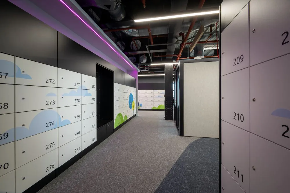 Spacestor also provided Storagewall and HotLocker solutions. These units cater to both general and personal storage needs, ensuring that employees have convenient access to their belongings in a fluid, agile environment. Bespoke graphics adhered to the front of the lockers add a unique touch, incorporating Mills & Reeve’s branding into the design. Additionally, Snugglestor, integrated into the locker runs, offer employees a comfortable spot to change their shoes or quickly catch up on their phone before heading out.
