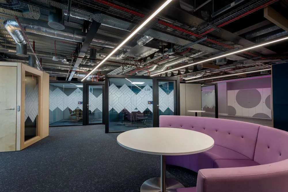 Employees can choose from various touchdown settings, pods for quiet work, team settings, meeting rooms and more. Desks for solo work occupy the office’s perimeter to maximise light and aid concentration – while more dynamic and collaborative settings are based in the core.