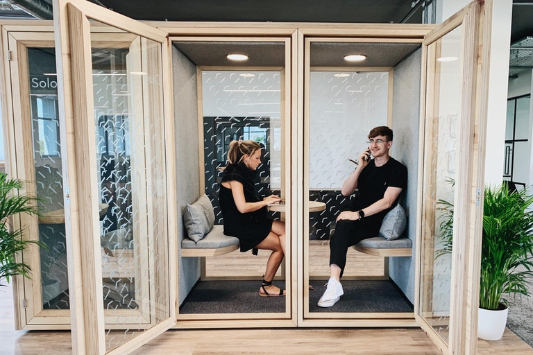 With a strong commitment to sustainability and wellbeing, we were pleased to supply our Residence booths and a curated selection of chairs to this environmentally-friendly design. Using custom graphics on the glazing, our Work pod became a 'Solo' and the Meet pod a 'Duo'; the perfect way to customize our products to reflect the brand of the user. These pods provide the necessary solitary space within the buzz of the office, for concentrated work or a private phone call. Finally our task chair, being 95% recyclable, not only supported their eco-conscious focus, but the chair's ergonomic design provides comfort and ensures employee wellbeing.