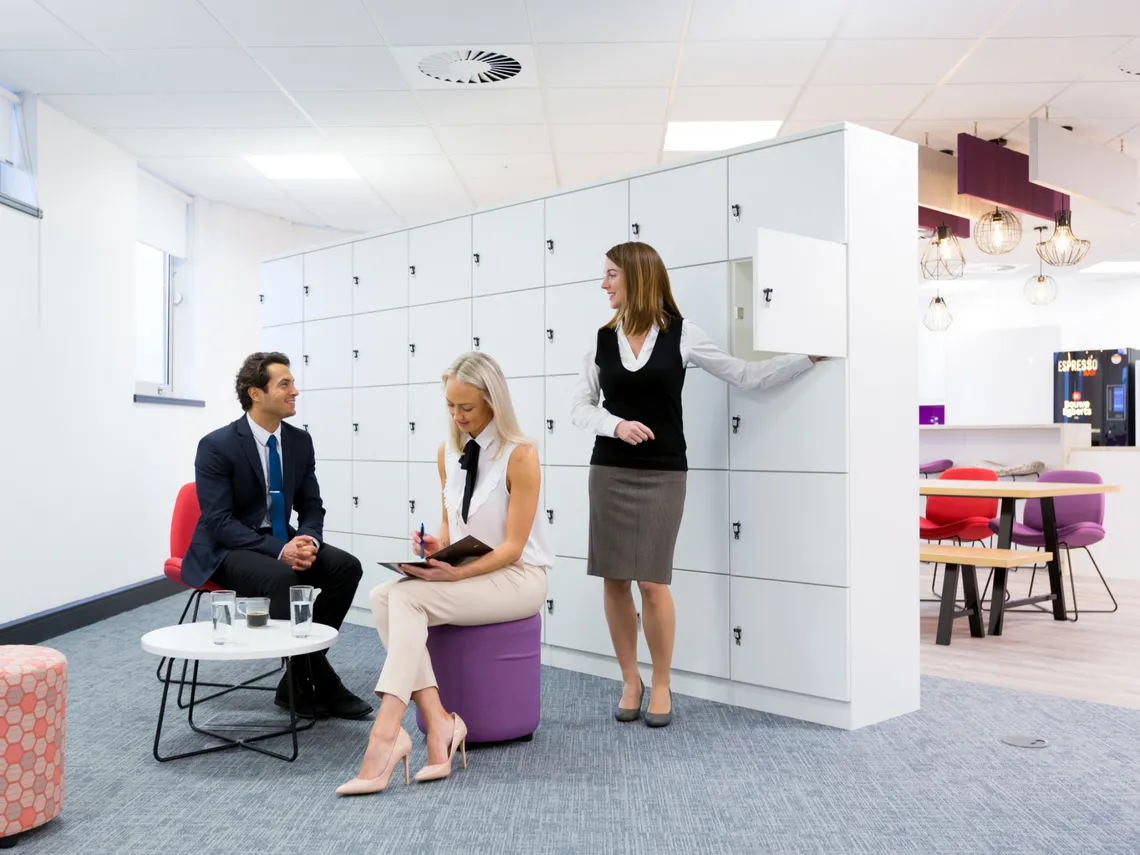 OEG Interiors designed their new workplace, and we installed a freestanding wall of our HotLocker lockers; here used not only for personal storage, but also as a zone divider between the shared kitchen and breakout areas.