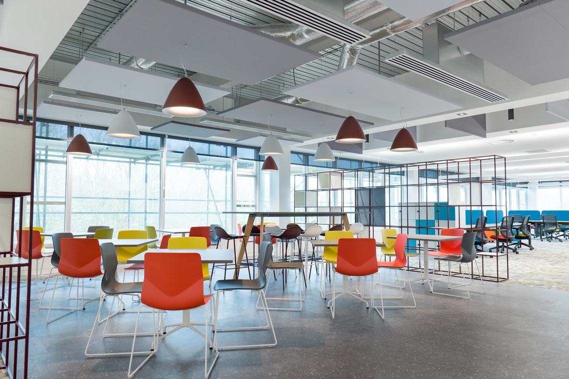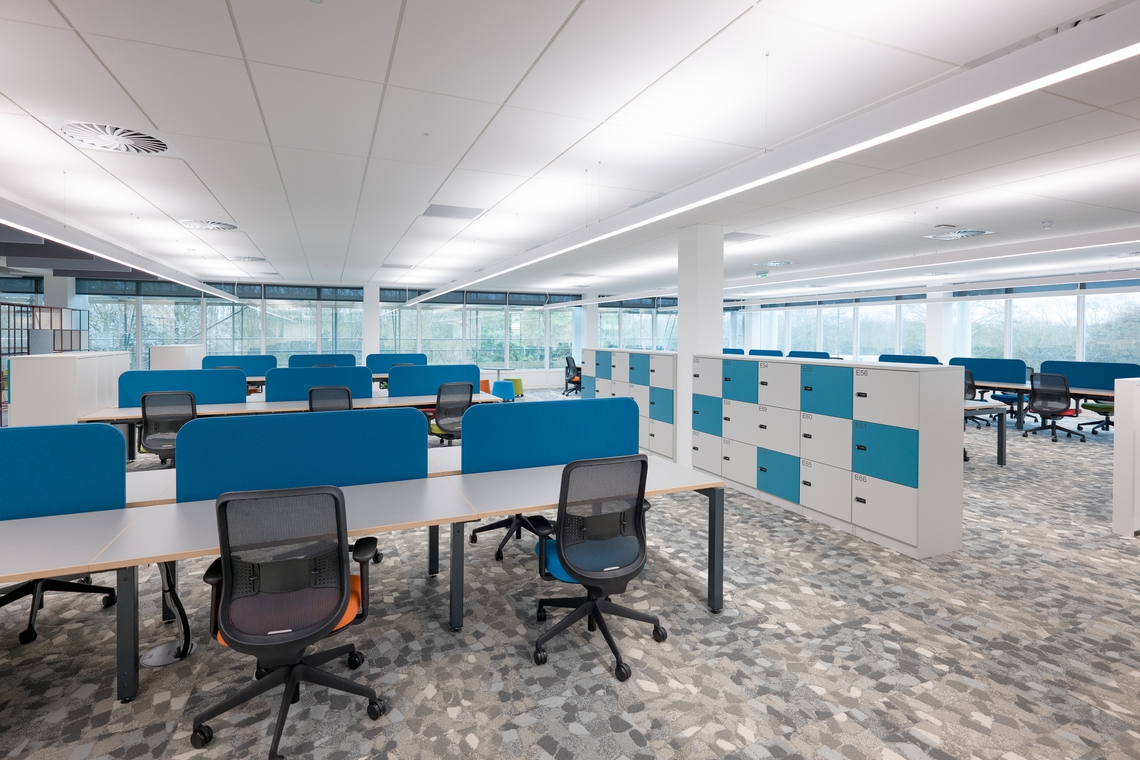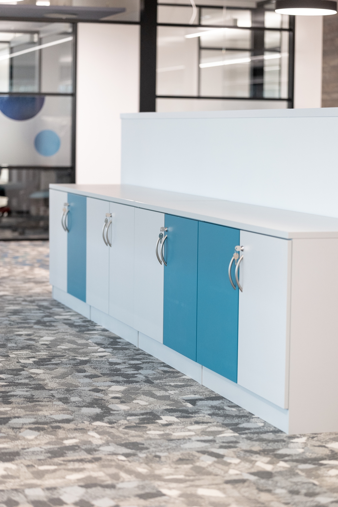 The light and minimalist Palisades II provides effective space division between the canteen area and the more focussed bench-desking. Spray lacquered in a purple finish, and accessorized with white alcoves and shelves it allows for an attractive division of space without the need to build walls, creating a more flexible workspace. The ever-essential workplace storage was provided for with our Forte Credenzas, with the same design aesthetics as the banks of lockers.