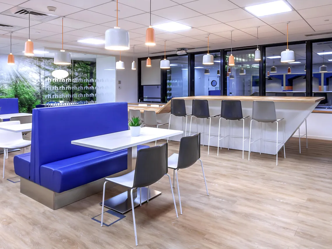 Arch Design placed a cafeteria at the heart of the space, where it could serve as both a relaxation and a meeting area, and surrounded it with a variety of meeting spaces suited to small working groups. As such, Spacestor were happy to install a run of three Railway Carriage meeting pods upholstered in blue with alternating light grey or orange; and rather harmoniously, the square arches of these Railway Carriages mirror the form of the famous Grande Arche de la Défense that has long been the symbol of the neighbourhood. Furthermore, we also provided a tower of HotLockers for employees to store their personal effects in, contributing to the making of a nice, welcoming workplace that can adapt to the needs of Robert Half International’s staff.