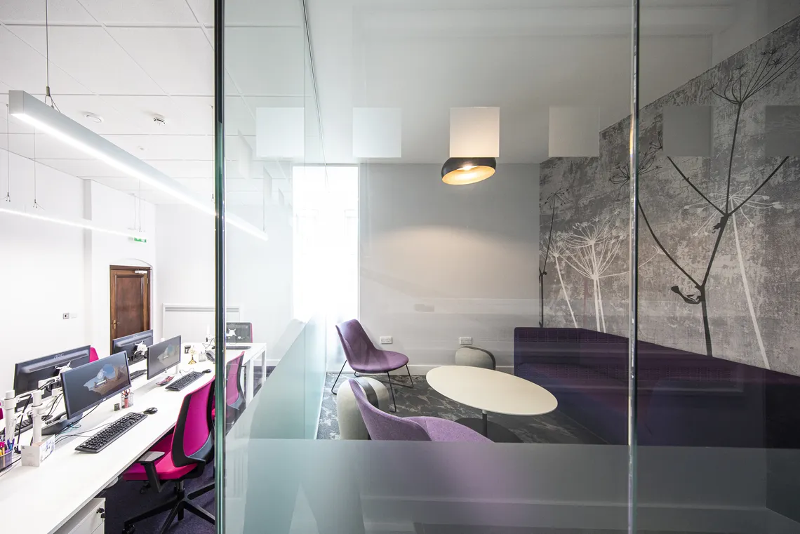 In the main common room space, modern and bright furniture create a welcoming space for the students to relax and take a break from their studies. The large open plan space is divided in the middle using our Palisades Grid, to create a multi-functional space with different activities taking place on either side of the divide. A large TV screen set into the Palisades Grid allows for greater tech integration and enhanced student experience.