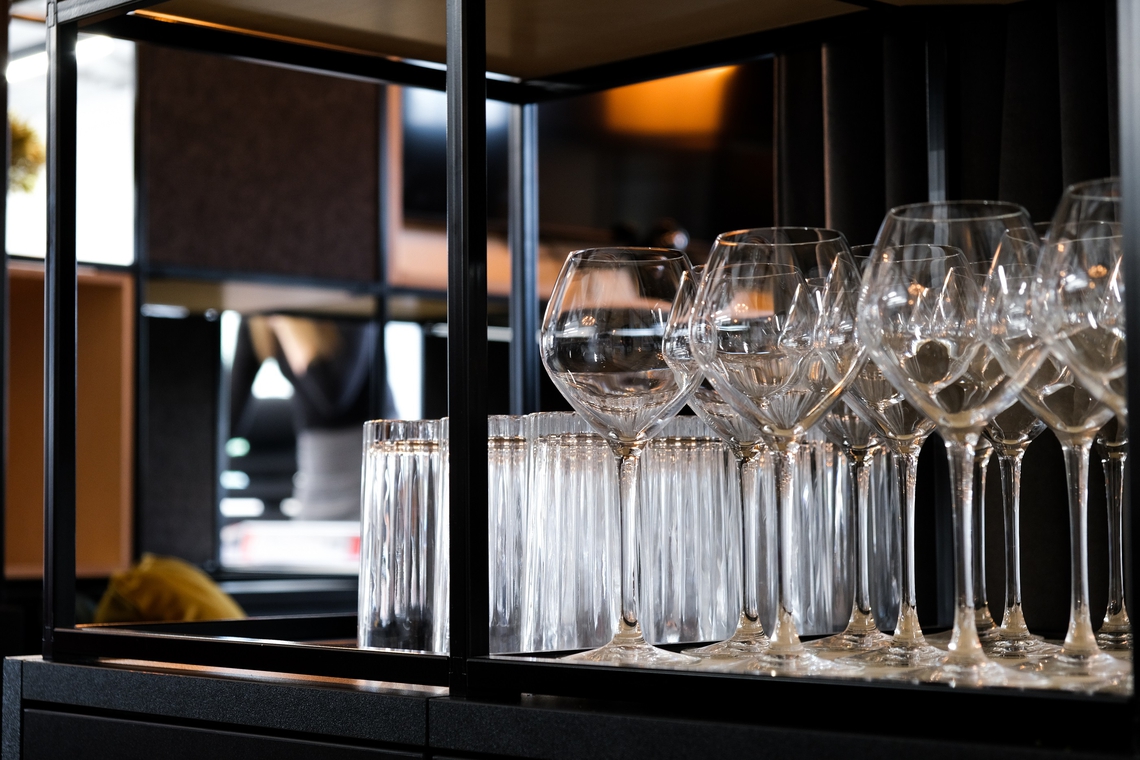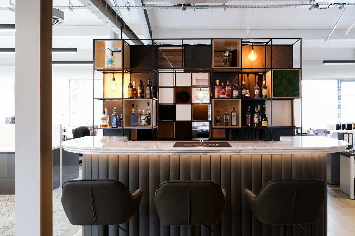 As part of their workplace redesign, Scott Osborn chose our Palisades II to create an inspirational semi-private, meeting space! Palisades II offers a new way to divide spaces and create different zones, in a light and minimalist way. Creating an architecture within an architecture, the configuration provides space for a meeting within the room and shelving for the bar on the outside! As part of the hugely flexible Palisades II system, this configuration includes a 2d ceiling, a plethora of acoustic panels, hanging lights and curtains to create a cosy aura and a luxe backdrop for the bar.