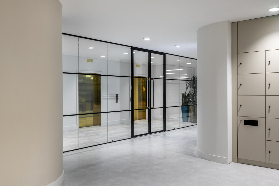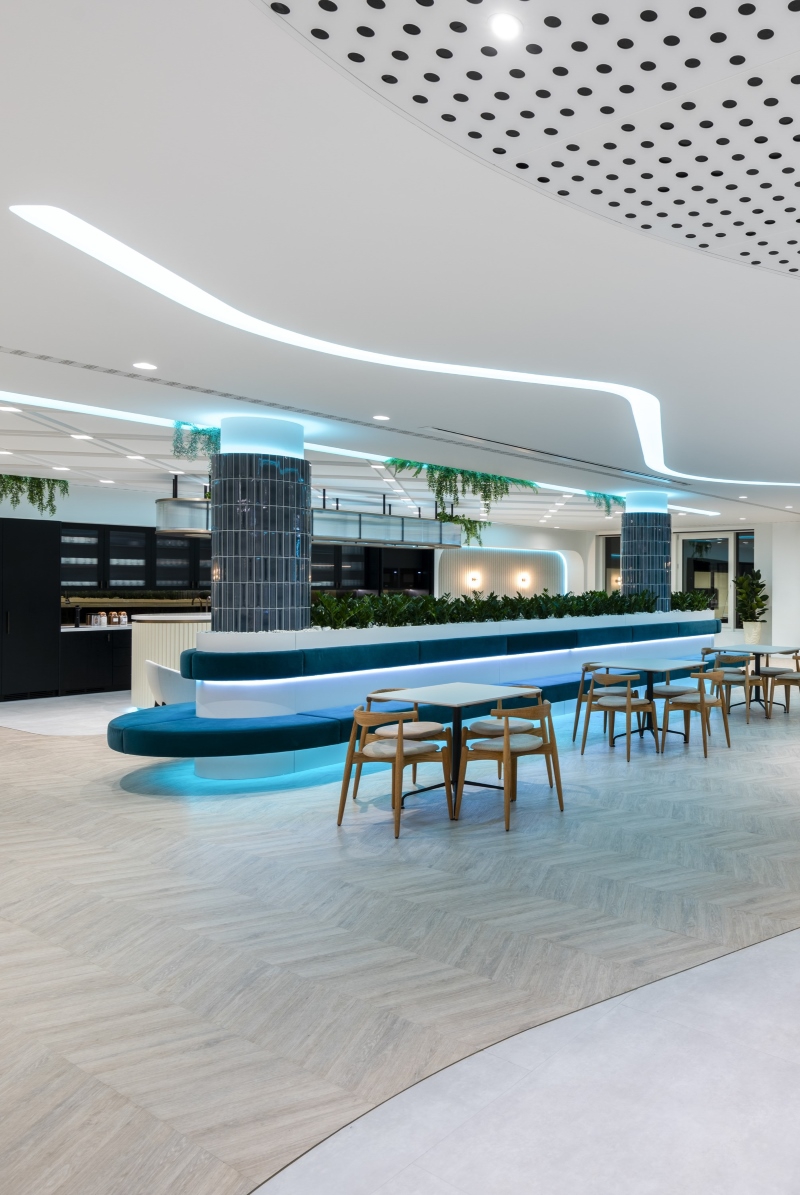 This premium workspace is finished in a way that is elegant and precise, with marble flooring throughout corridors, deliberately shaped sweeps, fluted glass, luxury furnishings, and sharp, contrasting details in black. The overall feel of the space is refined and sophisticated, with every new area having its own unique moment. The carefully considered design elements, including the flowing contours and seamless transitions between materials, create a sense of movement and fluidity, guiding occupants effortlessly through the space and reinforcing a dynamic yet harmonious workspace environment.