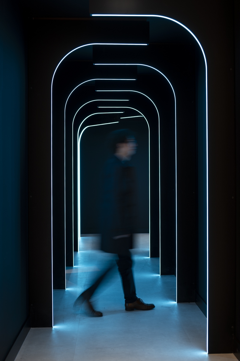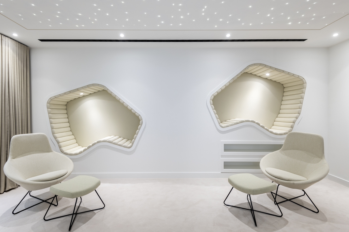 The calming atmosphere is emphasized through the use of lighting, which has been meticulously crafted to enhance the feel of the space. Many features have been used, such as cove curved strips, picture lighting over golden plaques, shaped suspended fittings and blue droplights. Leading down to a wellbeing room is a statement corridor with carefully positioned blue lighting, outlining the rounded walls and setting the tone for the haven. Once in there, one is met with a starry sky ceiling, crafted using miniature spotlights in the ceiling.