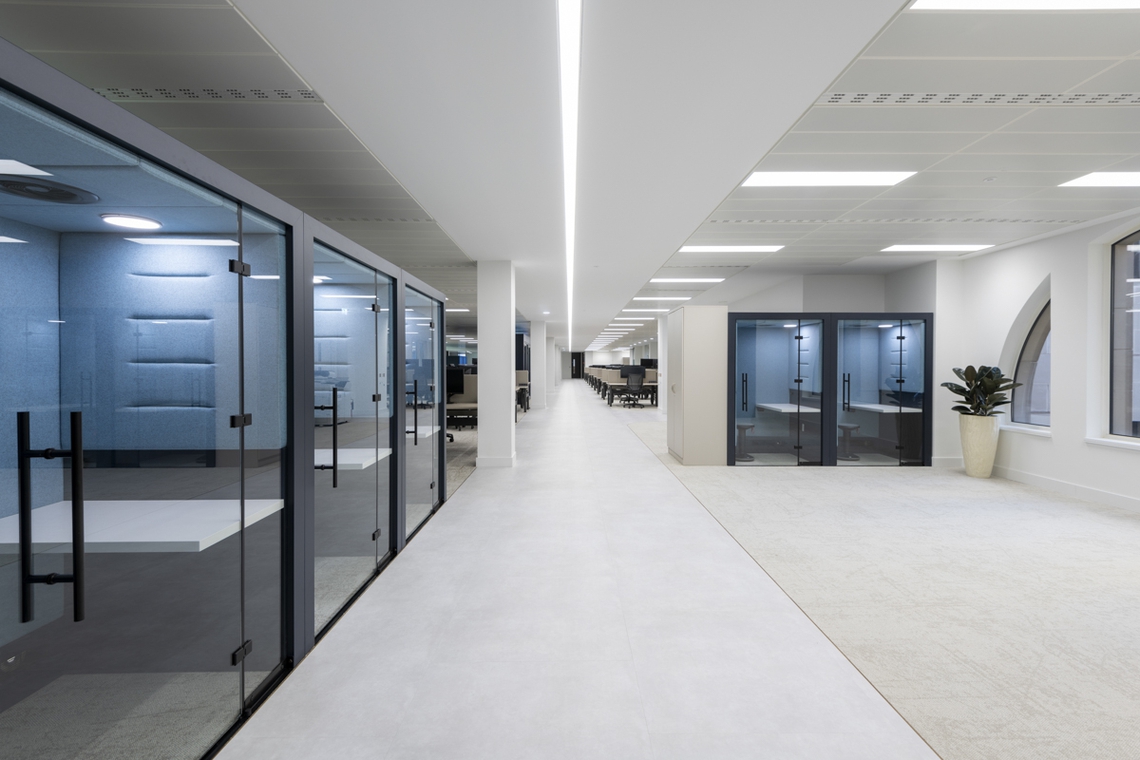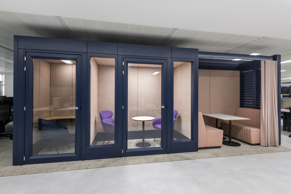 Portals Quiet, were selected in varying colours to fit in with different areas, harmonizing flawlessly with the aesthetic of this workplace, where there is a lot of glass, and black detailing, such as on the door handles and frames. These booths not only offer a functional solution for focused, private work but also demonstrate how our products can be tailored to align with a company's identity. By integrating in a balanced way to thedesign scheme, they enhance the visual character of the space while providing practical benefits, reflecting the unique culture and style of the organization.