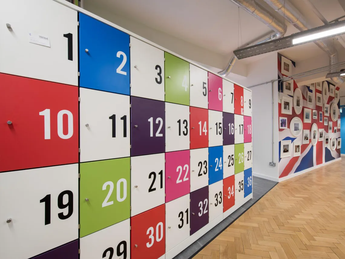A colouful bank of modular HotLockers on a background of modern white gloss with customised numbered doors.